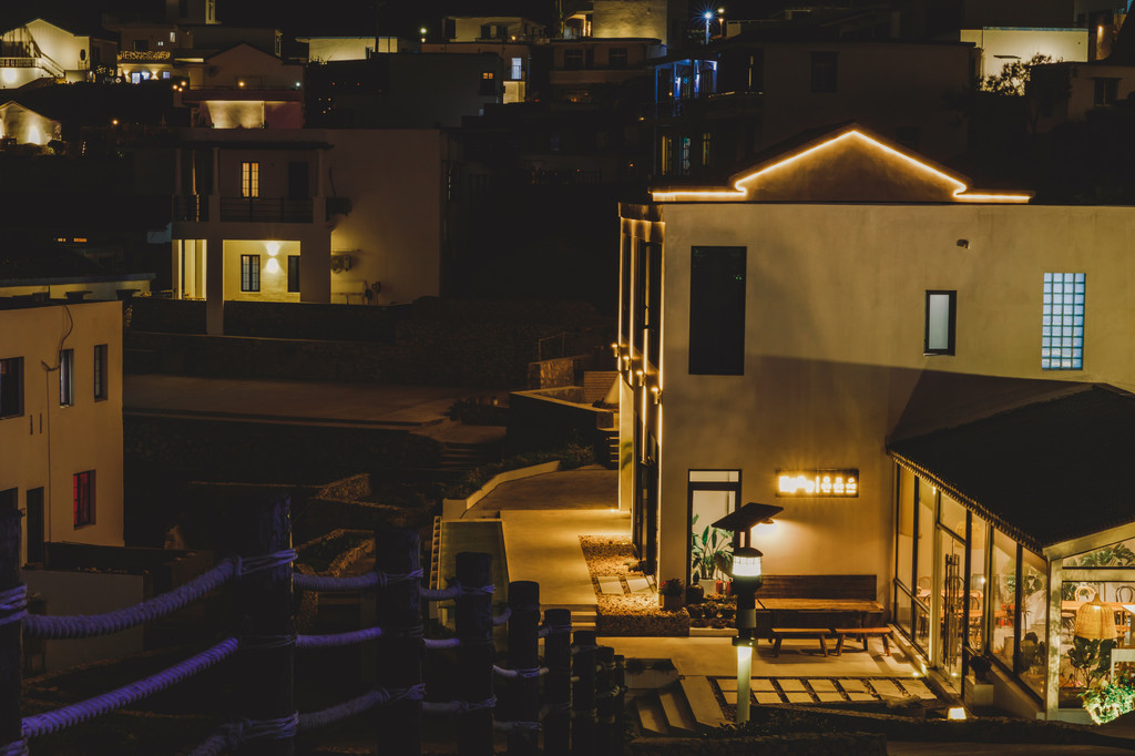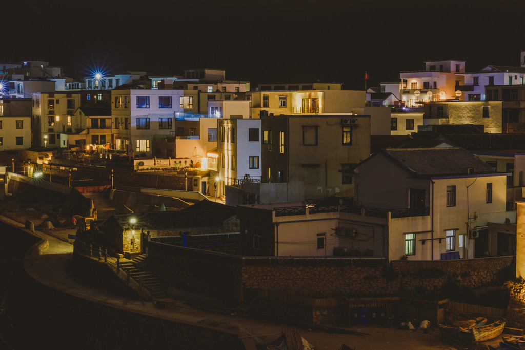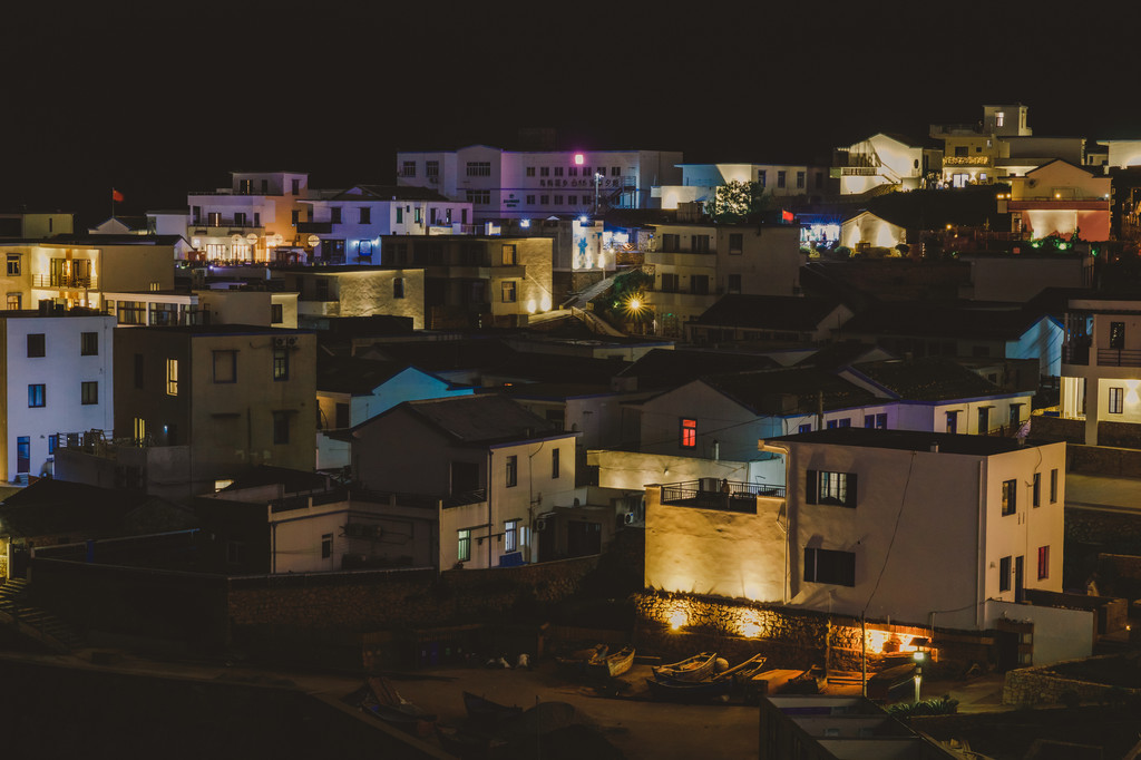 回到民宿门口,我们才看见所有蓝房子都亮起了灯光,特别好看。爬上白天拍照的山坡,欣赏花鸟岛的夜景。虽然夜晚的灯光并不壮观,也不绚烂,只有淡淡的几盏灯光,但是显得更加温馨静谧,晚上的花鸟岛真的有“圣托里尼”浪漫的感觉~