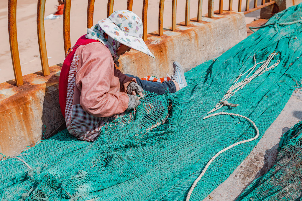 环海公路两边堆积着很多渔网,禁渔期间,渔民们就做一些缝缝补补的工作。有些渔网还残留着海鲜的尸体,散发出一股恶臭的鱼腥味,得憋着气走开。