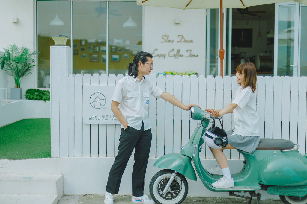 花鸟岛有一家民宿叫吴小姐的家,经营者是一对情侣,15年来到花鸟岛,便决定在这里开民宿。那时候花鸟岛的旅游业刚刚起来,他们做到现在已经是小有名气的网红店了,不光可以住宿,还可以来吃饭、喝饮料。民宿是一栋白色的两层楼小屋,门口是块小花园,有一辆草绿色的机车,太适合拍照了。