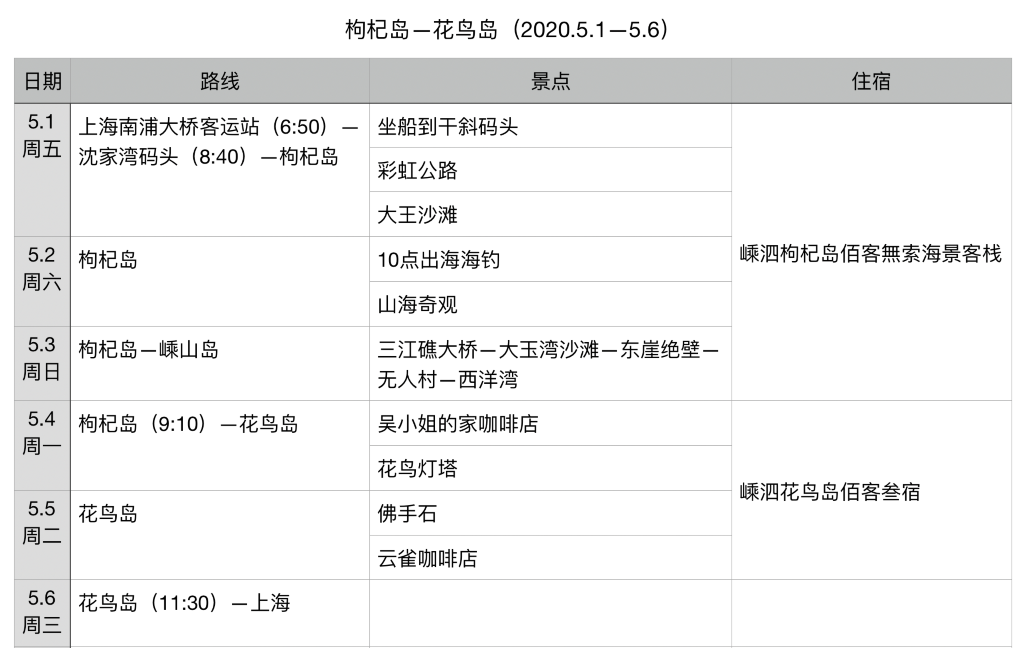 枸杞岛和花鸟岛都建议玩3天2晚,景点不是很多,只是路途比较波折。