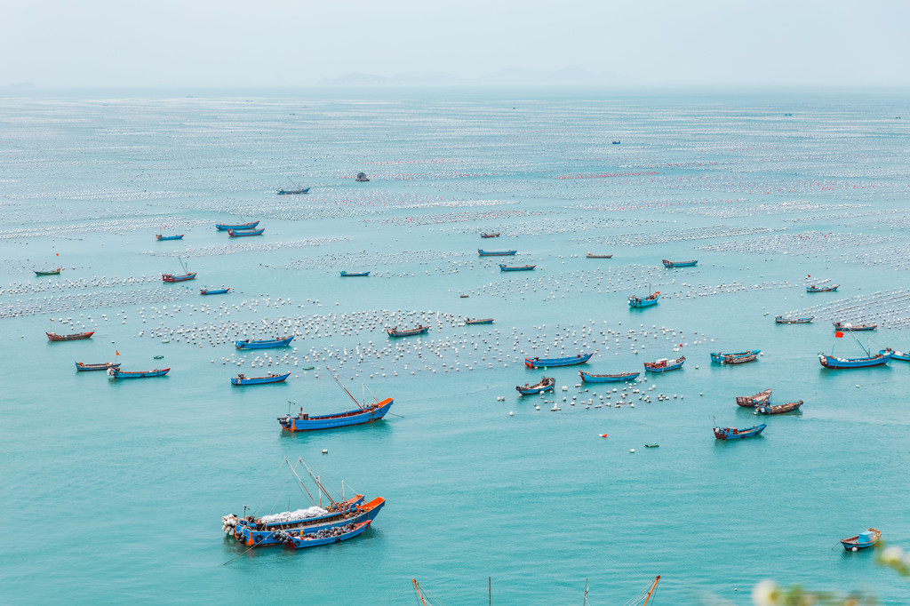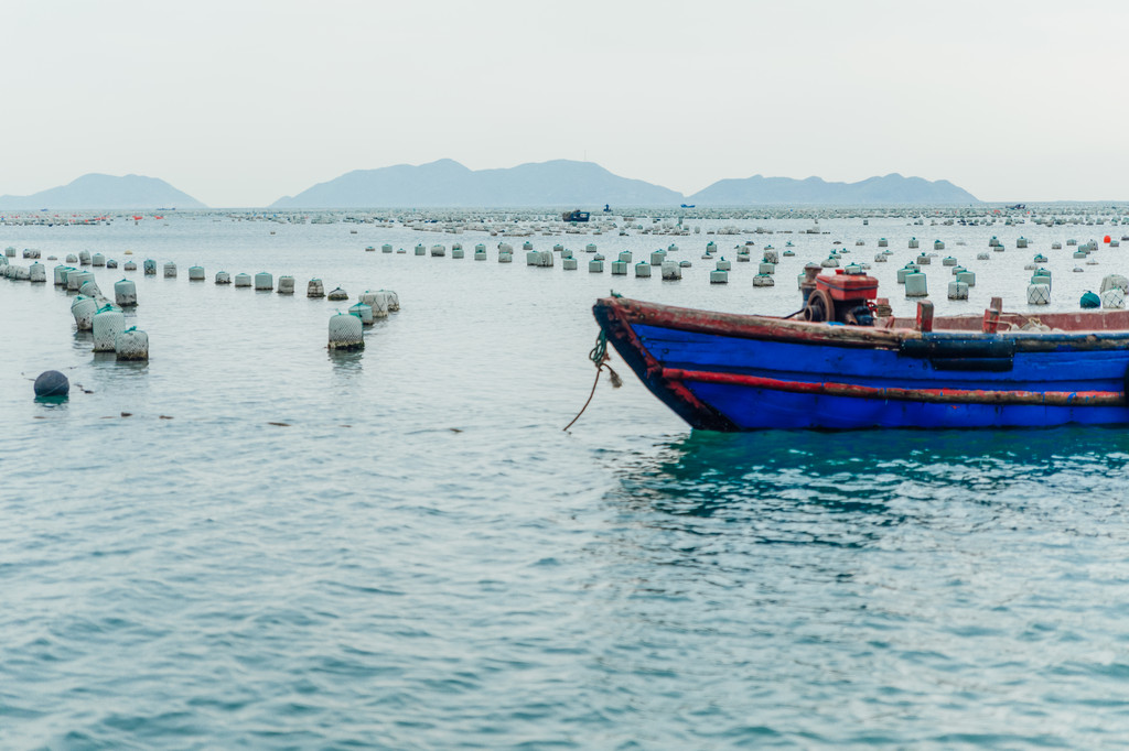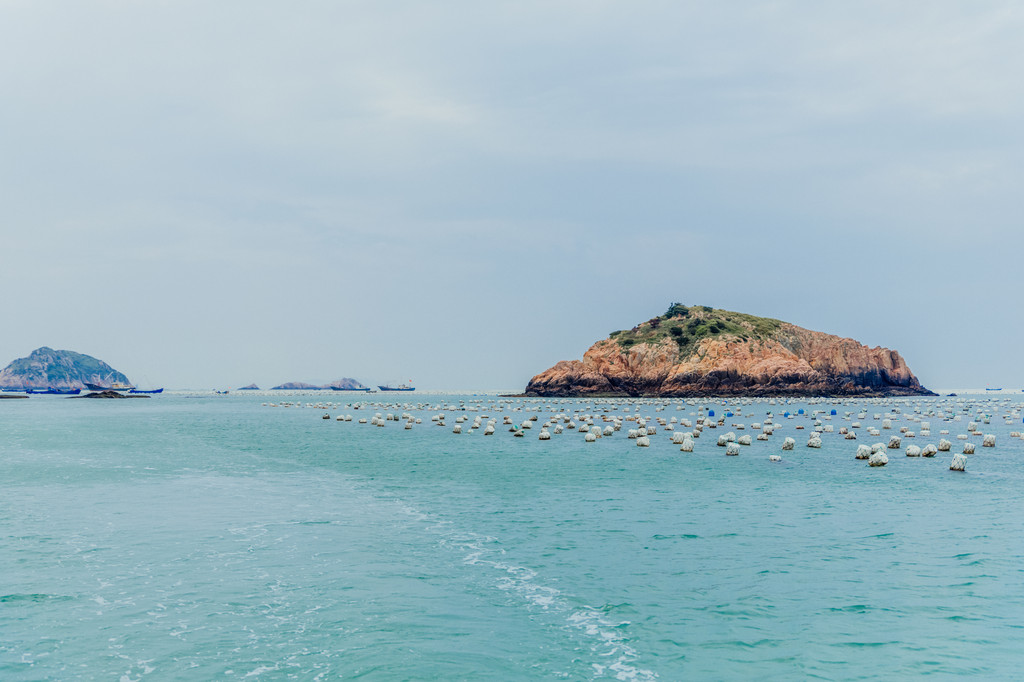 枸杞岛有很多海上牧场,海上牧场是指渔民规划出一片海域,利用自然的海洋生态环境,采用规模化管理,将捕捞的海鲜进行放养。我们肉眼看到海上的白色浮子,底下养着的都是贻贝。因为面积非常大,看起来真的很壮观。