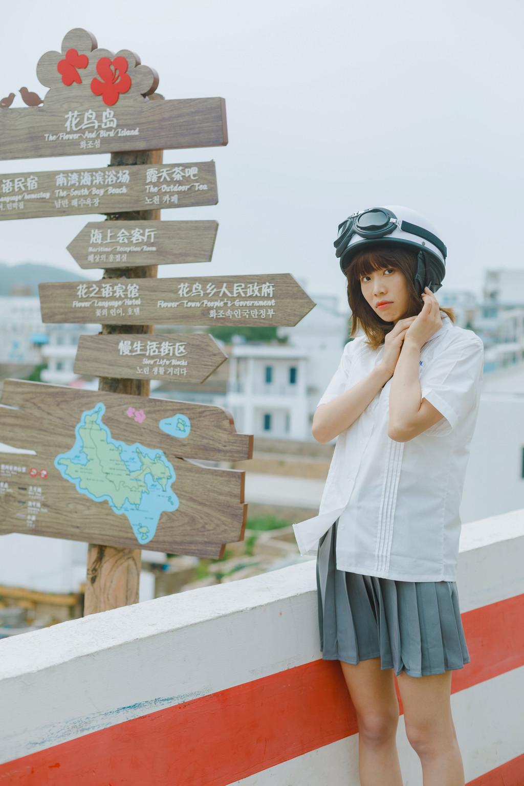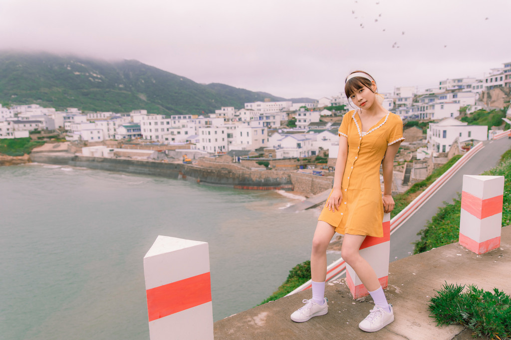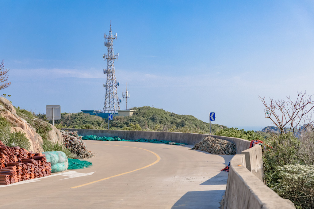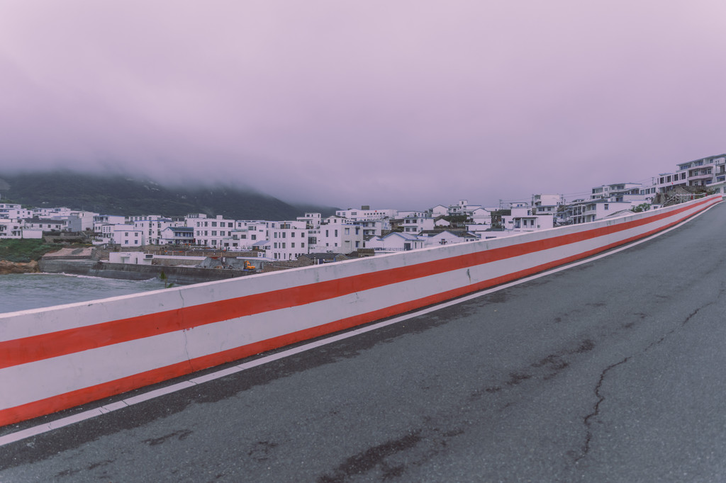 另一个就是花鸟码头到指示牌这段环岛公路,这里的环岛公路是红白相间的,非常小清新。把相机放到路对面的山坡上,俯拍公路、南湾沙滩和蓝房子,是个很不错的角度。