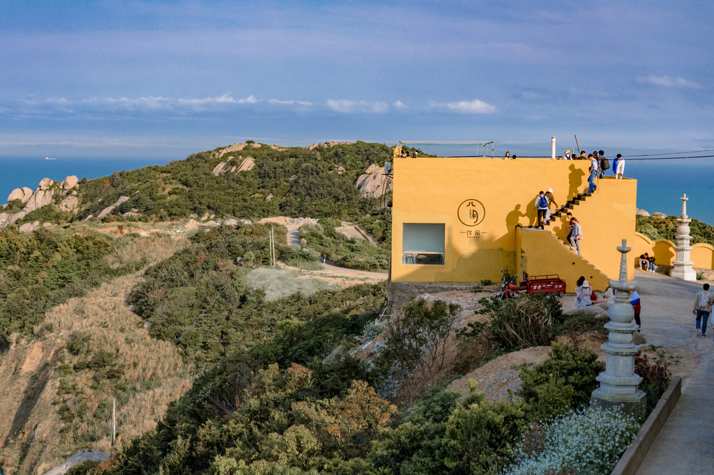 山海奇观附近,有一栋黄色的建筑,是一家叫八月的饮品店,但是没有开门。这里已经是一个出名的网红拍照地,沿着楼梯上平台,很多女孩在这里拍照。平台风特别大,我眼睁睁看着两个女生的帽子被吹走了,而我的帽子昨天被吹到海里,今天索性就没戴帽子啦。
