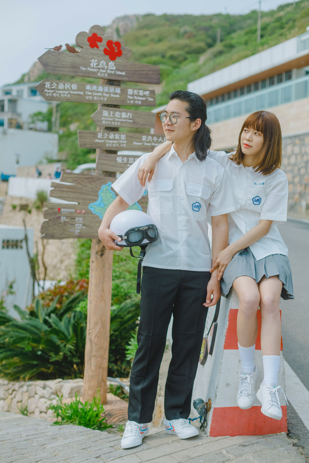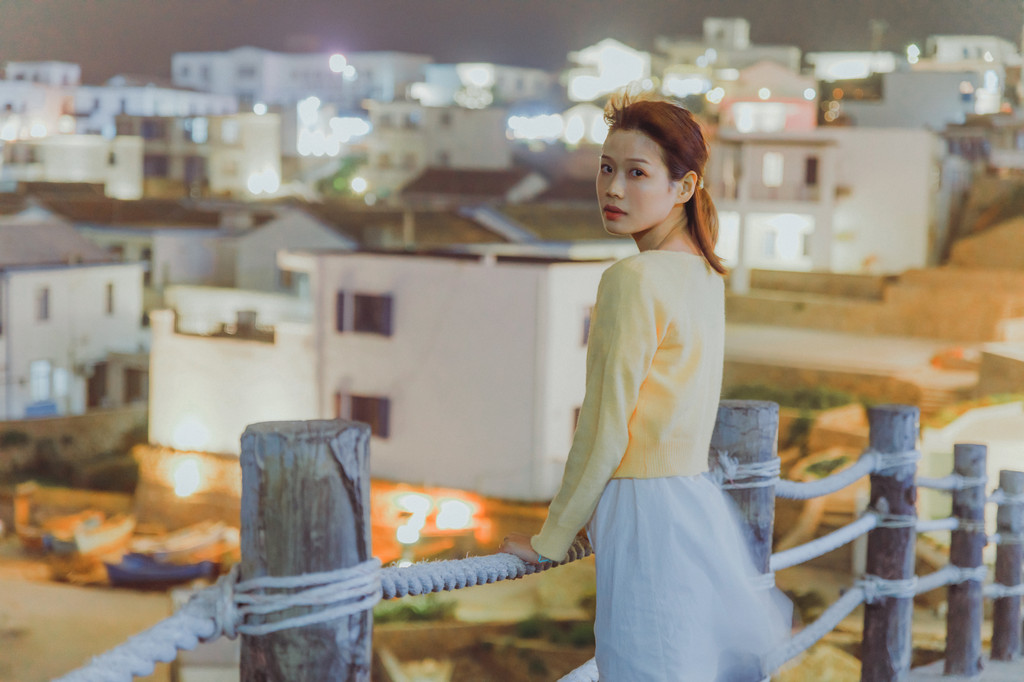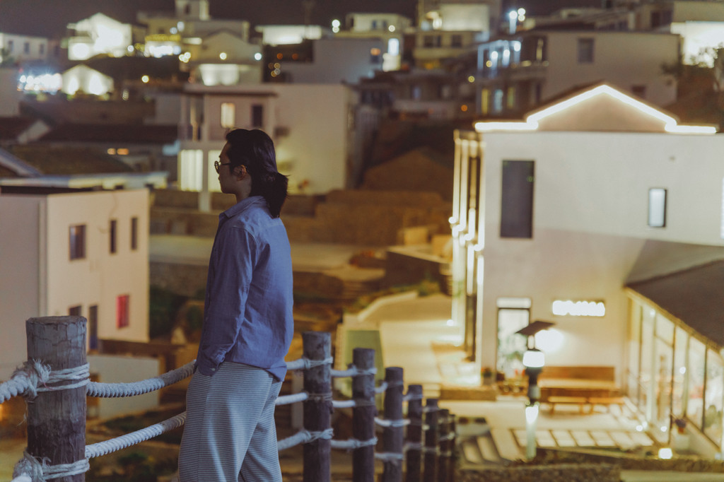 民宿旁的路牌这个位置拍人像夜景特别好,我们立马回房间拿了三脚架拍合照。因为我们的民宿在进村入口处,可以拍到背后整片房子,一起眺望远方,浪漫的一天结束了。