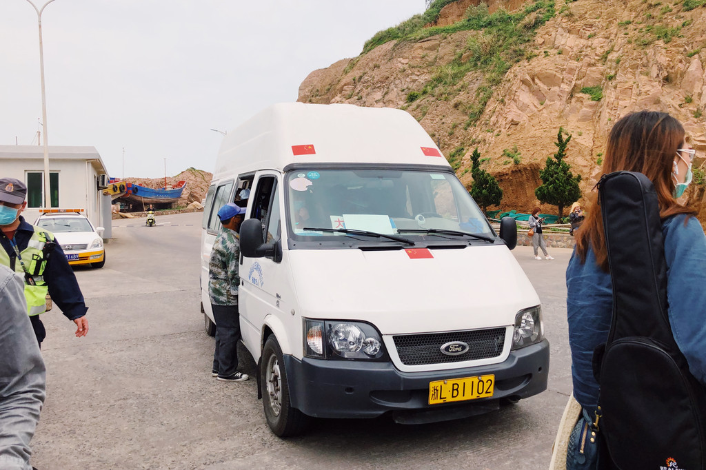 不久来了两辆小巴车,也就是枸杞岛的公交车,一辆去嵊山岛,一辆去大王沙滩。但是我们行李太多,没挤上去,只好继续等待。