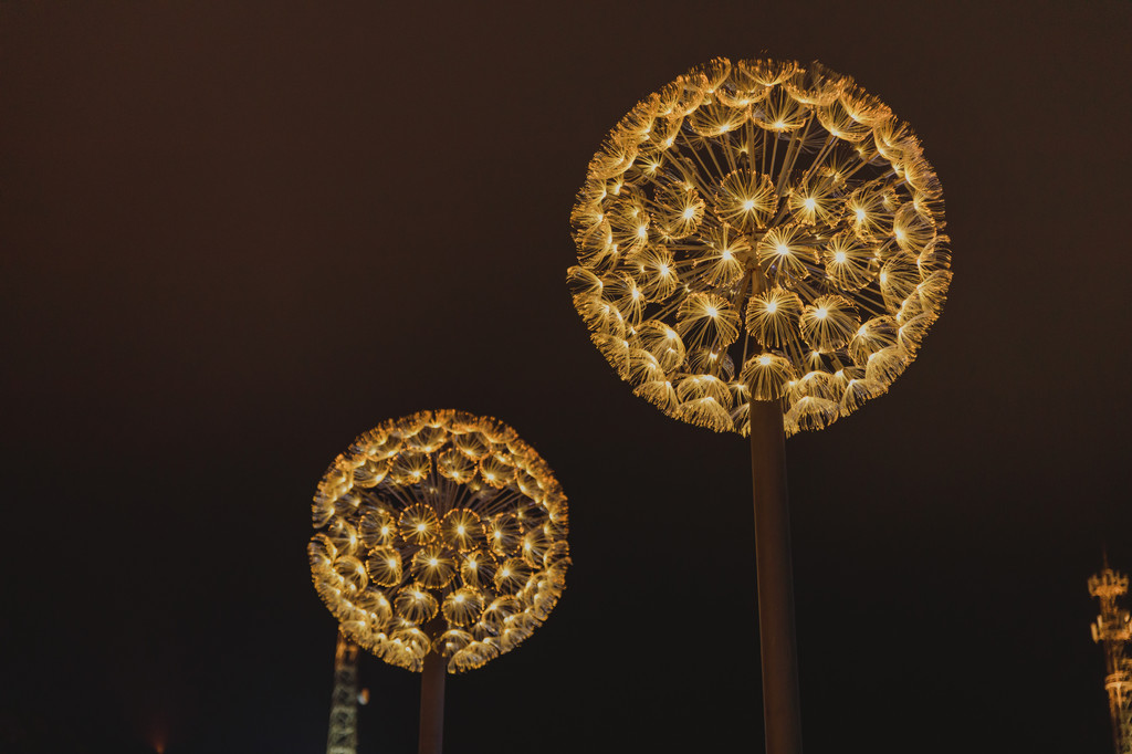 路边有四盏蒲公英形状的灯,白天看见就觉得造型非常逼真,夜晚亮着光更加梦幻。