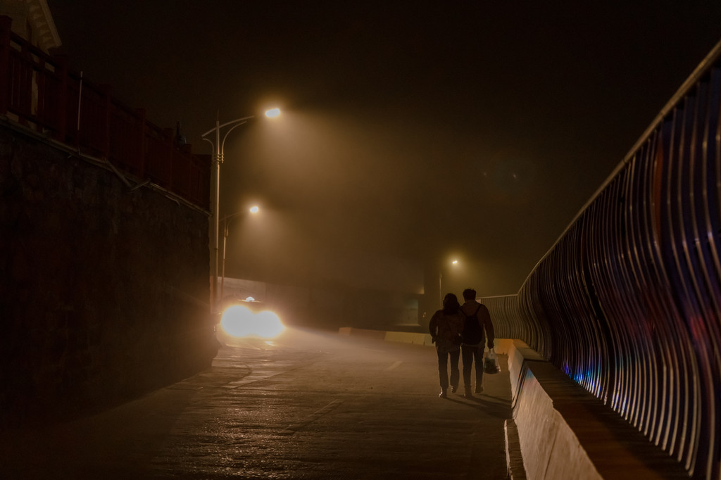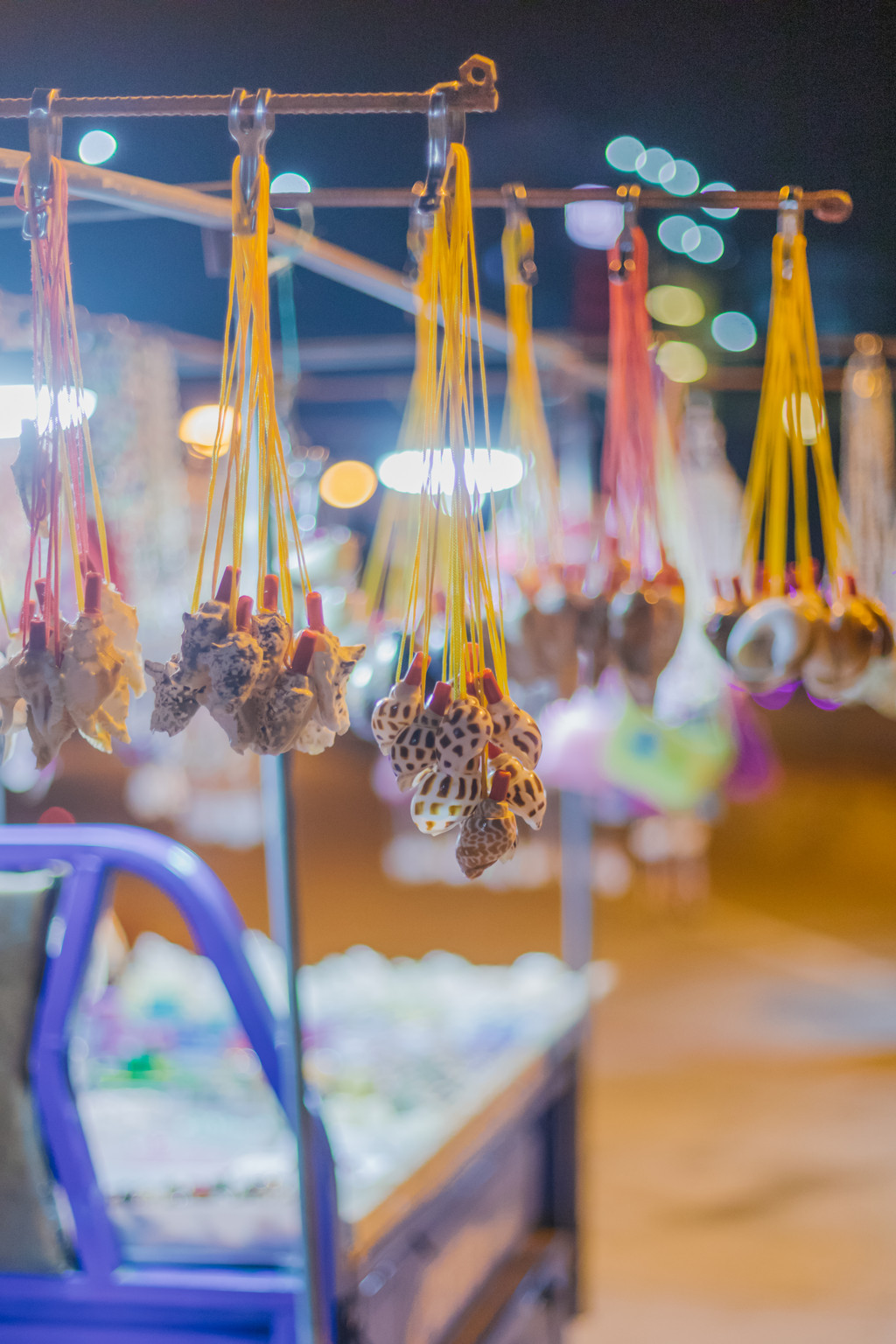 天色渐暗,背后的路灯亮起,透过遮阳伞的草,还可以营造出一种逆光的感觉。