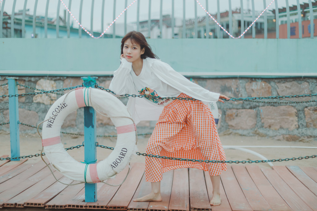 另一个机位就是栈道,也是糖果蓝,栈道两边挂着好看的游泳圈,可以互动,太有海边的感觉了。如果穿套海军风格的衣服,一定很适合。