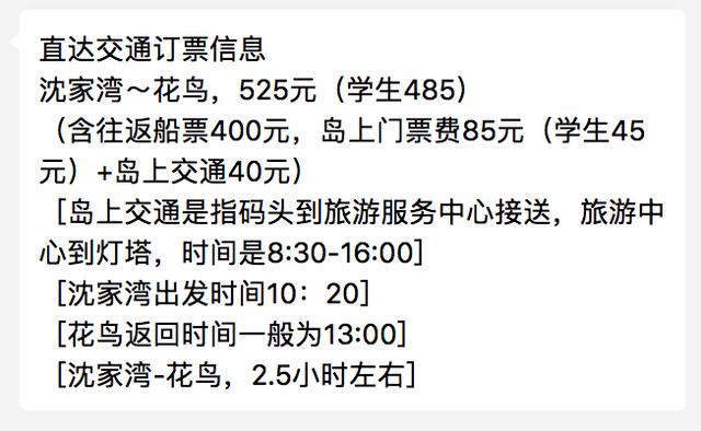 要去花鸟岛,首先要预定民宿。民宿老板会帮你定船票。预定民宿首推靠海一线位置的民宿,在露台或者院子里能看见大海的位置最好。登岛的游客数量受计划控制,所以自己是买不到直达船票的。在嵊泗客运公众号上也查不到船。具体的费用如下: