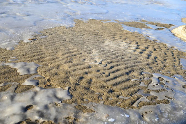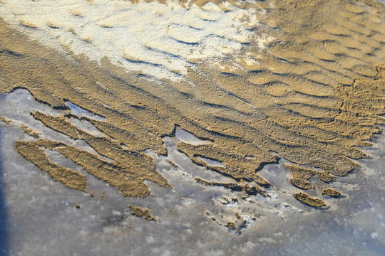 冬天来得如此肆无忌惮,茫茫大漠放任了它的张狂和淘气,即便有湖水的“退避三舍”,大漠依旧保留着湖水曾经的踪迹。