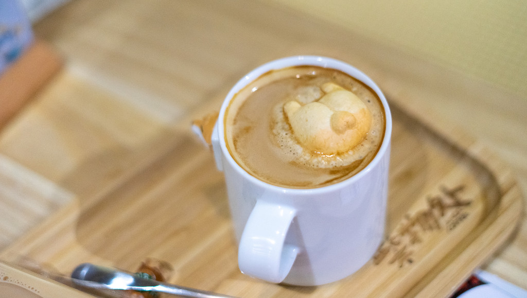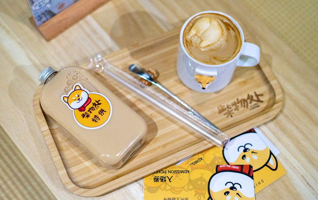 店里的饮品甜品也超可爱,都是柴犬形象。点了咖啡跟奶茶,咖啡里用棉花糖做了柴犬的屁股,超q不忍心喝掉。