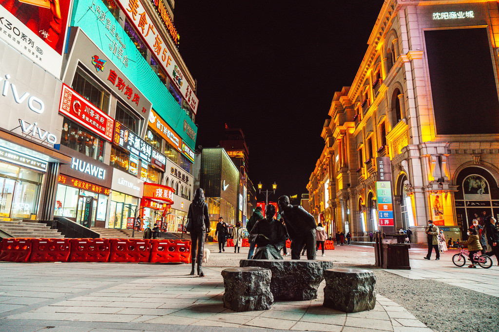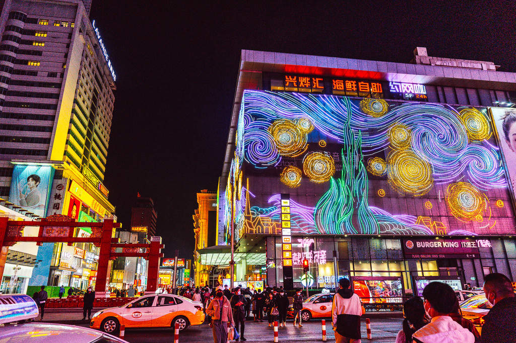 从元气·柴物处所在的大悦城出来,便是沈阳最最热闹的中街啦。说是沈阳吃喝玩乐的集散地不为过,也是潮人们最爱逛吃逛吃的地方。夜晚有着灯光的加持,一片灯红酒绿的热闹,我还看到了用我最爱的梵高《星月夜》装饰的商场外墙,色彩缤纷很是好看。