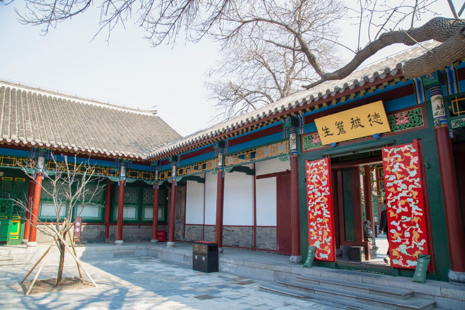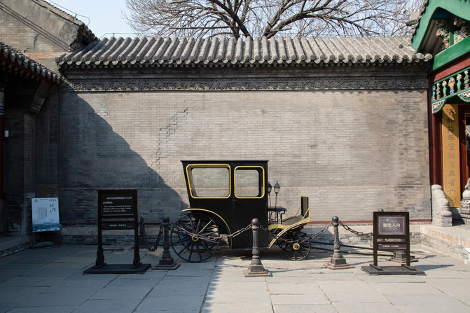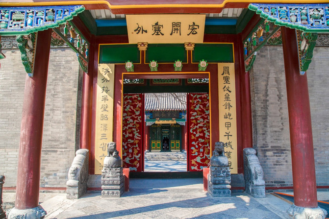 三进四合院坐北朝南,呈“目”宇型,青砖班瓦,飞檐兽吻挑脊,雕梁画栋,朱漆廊柱,石鼓柱础,石条台阶,方砖方石铺地,是砖木结构的仿王府式建筑。