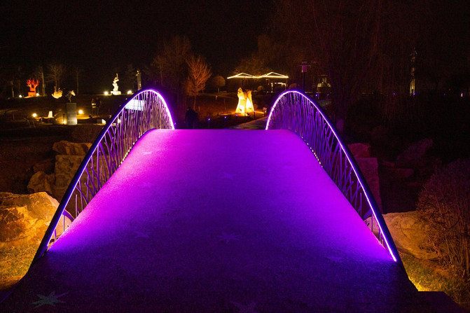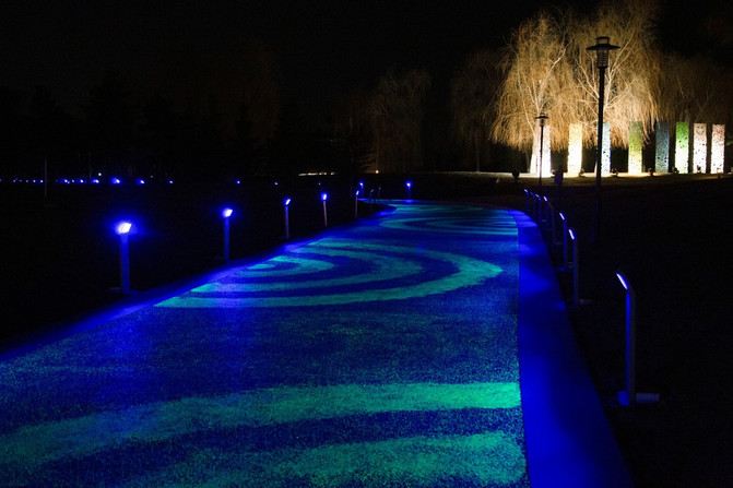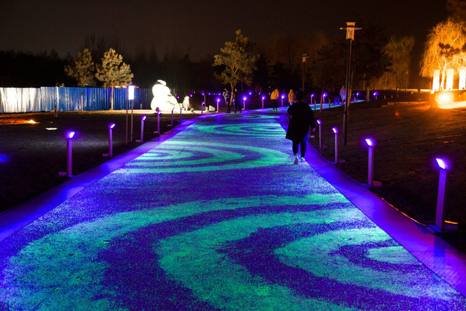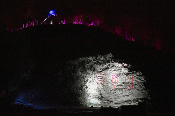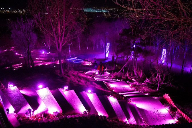 夜晚的莫子山公园被荧光包围着,仿佛一个天外世界。这里融合了山、水、林三位一体的自然景观特色。以山水为骨架,以森林为主体,以各类风格各异的花园为特色,形成山水相依的自然景观。