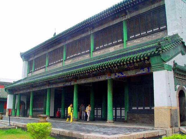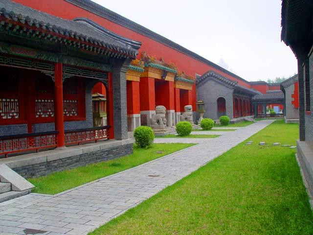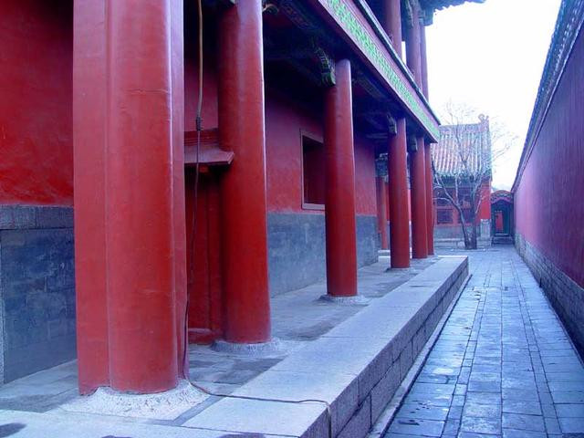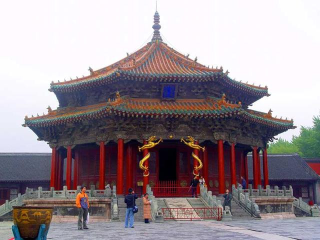 宫殿殿身的廊柱是方形的,望柱下有吐水的螭首,顶盖黄琉璃瓦镶绿剪边;殿柱是圆形的,两柱间用一条雕刻的整龙连接,龙头探出檐外,龙尾直入殿中,实用与装饰完美地结合为一体,增加了殿宇的帝王气魄。