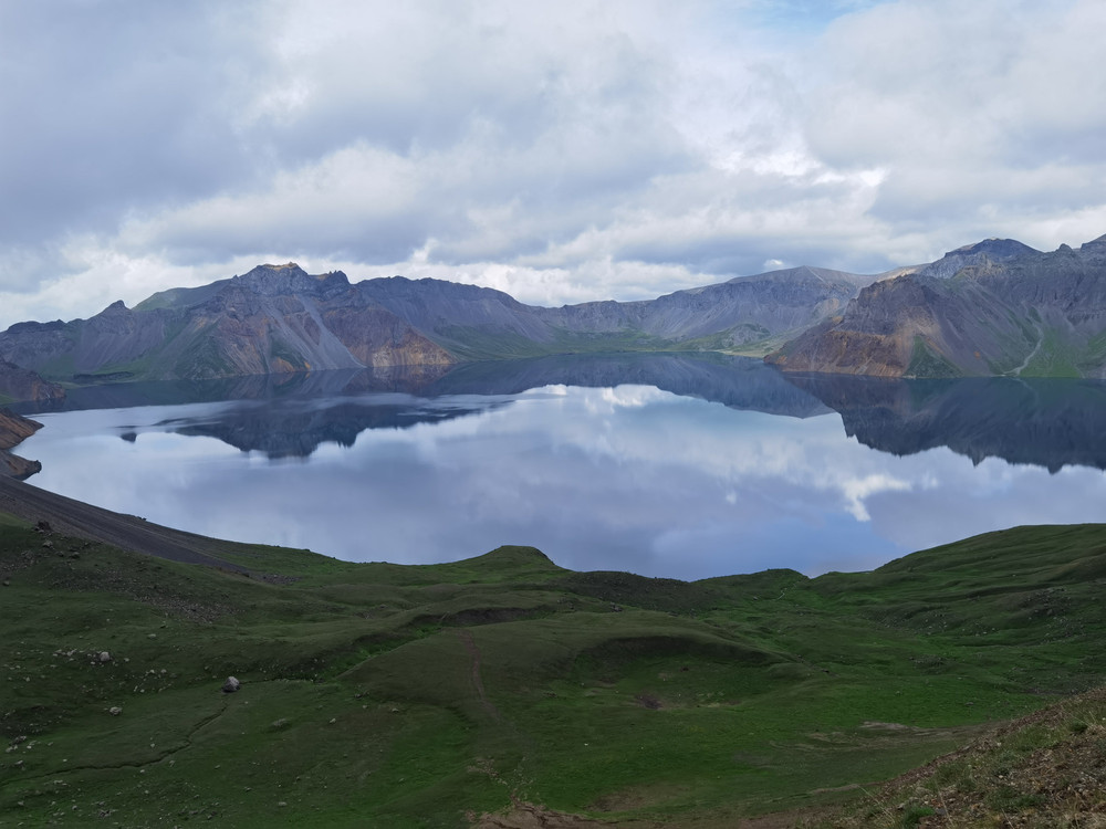 终于登顶了,先抓紧在观景台最佳位置排队请人拍了合影,再细细品味她的美吧。第一眼看到她时,就被她平静的水面打动了。宛如一块明镜,嵌在岩石打造的基座上,映着天空的样子,仿佛能通过它,穿越到另一个世界。环顾湖边,没有任何活动的生物,更没有什么水怪的踪迹。也许又是一个吸引游客的噱头说不定。我们登顶后不过半小时的时间,天池就被乌云遮盖了。反正看到了天池,也没什么遗憾了,在观景台席地而坐,多欣赏下天池的美吧。如果你爬不动,钱包鼓鼓,也可以请轿夫抬你上来,按体重收费。
