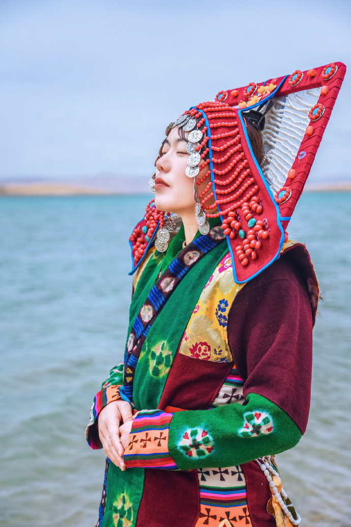 硕大夸张的头饰由巴果、巴龙、达勒组成;上衣和裙子都较长,常以五颜六色的氆氇或呢子等材质为料子,做成褶皱的样式;牛皮做的腰带上面有银币大小的海螺、铜镜、铜勺等小配饰,穿上它,既有艳丽夸张色彩,也有厚实耐寒之实效。