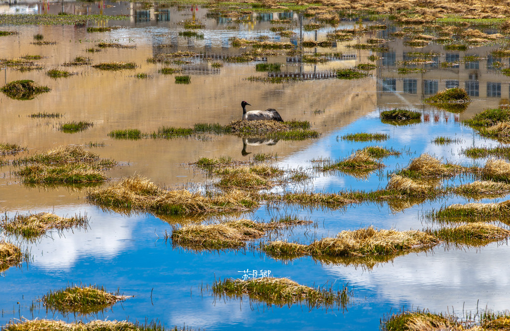 就在县城边上,也在甲岗拉姆雪山脚下。藏族人称黑颈鹤为“宗宗”,意为天鹅,这是世界上已知15种鹤类中惟一存于高原的鹤。