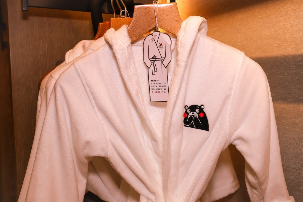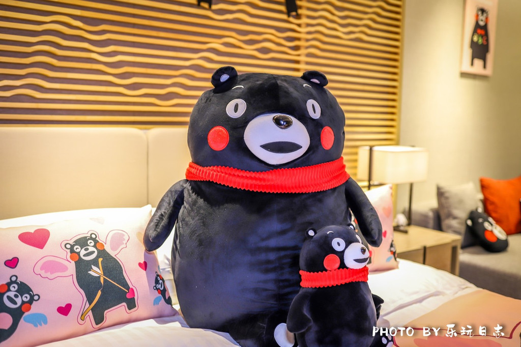 进房就可以看到各种尺寸的定制版 熊本 熊公仔被放置在房内各个位置,其中最大的半人高的 熊本 熊玩偶放在床上,而和它在一起的还有一个袖珍 熊本 宝宝,十分可爱,很适合抱着它拍照片。