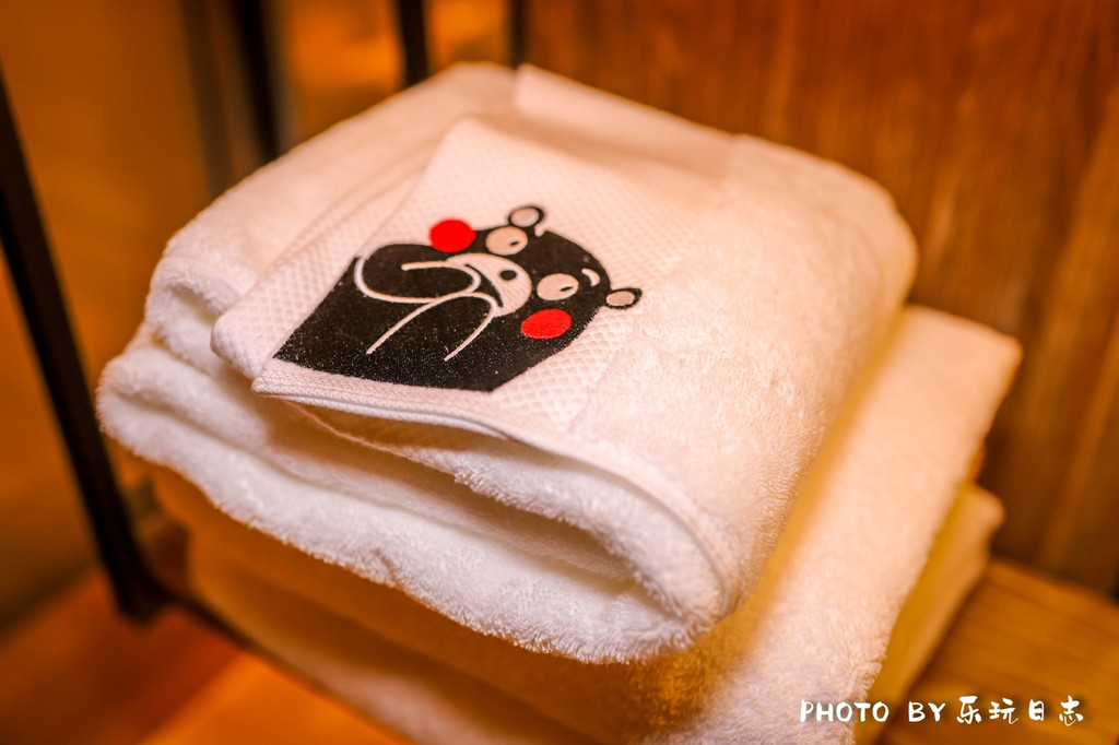 再说说卫生间里面的 熊本 熊元素,也相当丰满:浴帘、壁画、浴巾、面巾、方巾清一色 熊本 熊系列,足够亮眼了。
