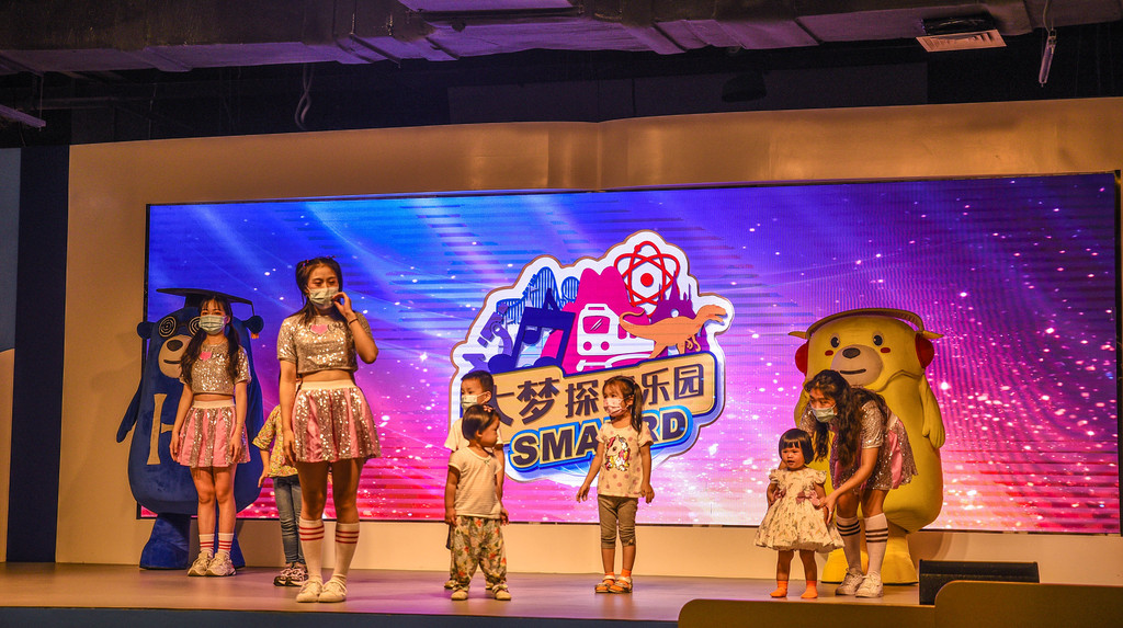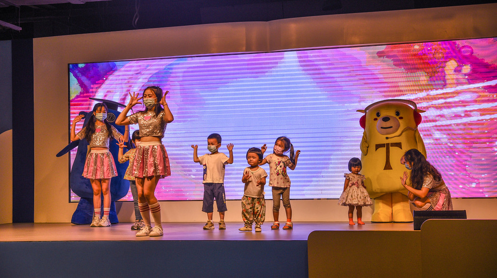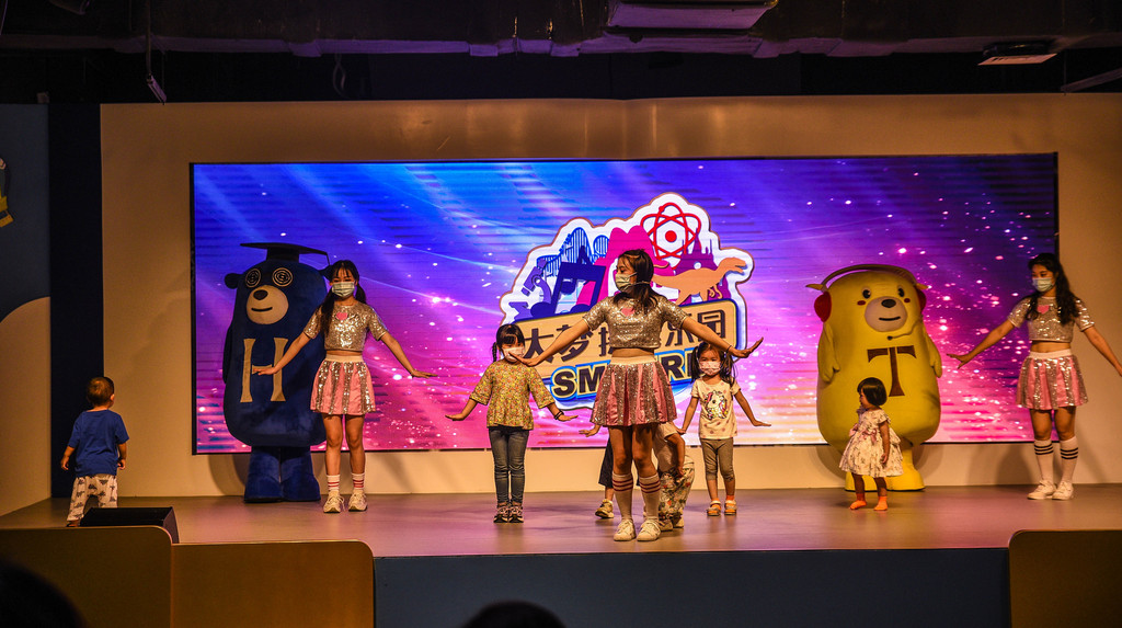 玩累了,坐下来看看歌舞表演休息一下,歌舞很活力很精彩,小姐姐表演完后,主持持人还会邀请台下的小朋友上台互动。