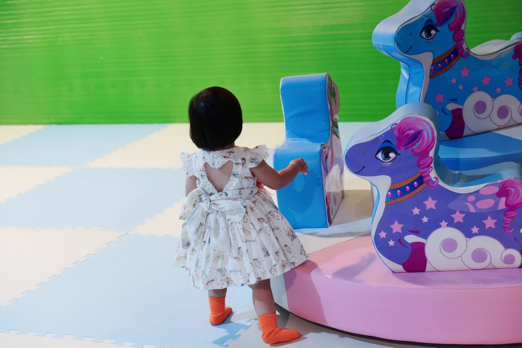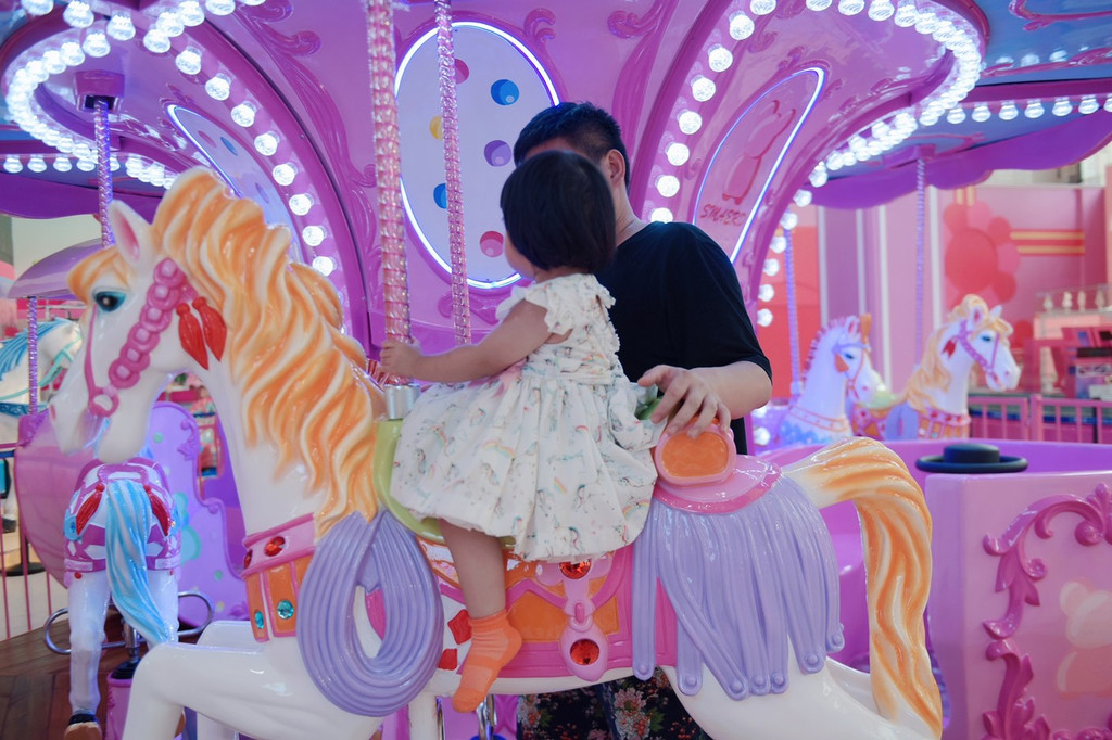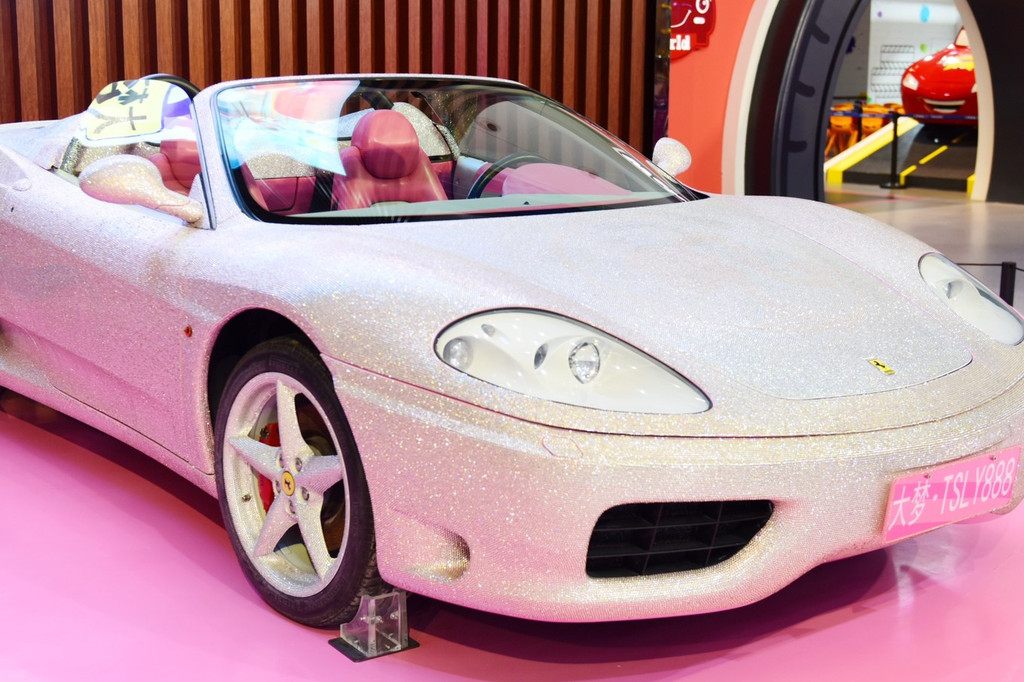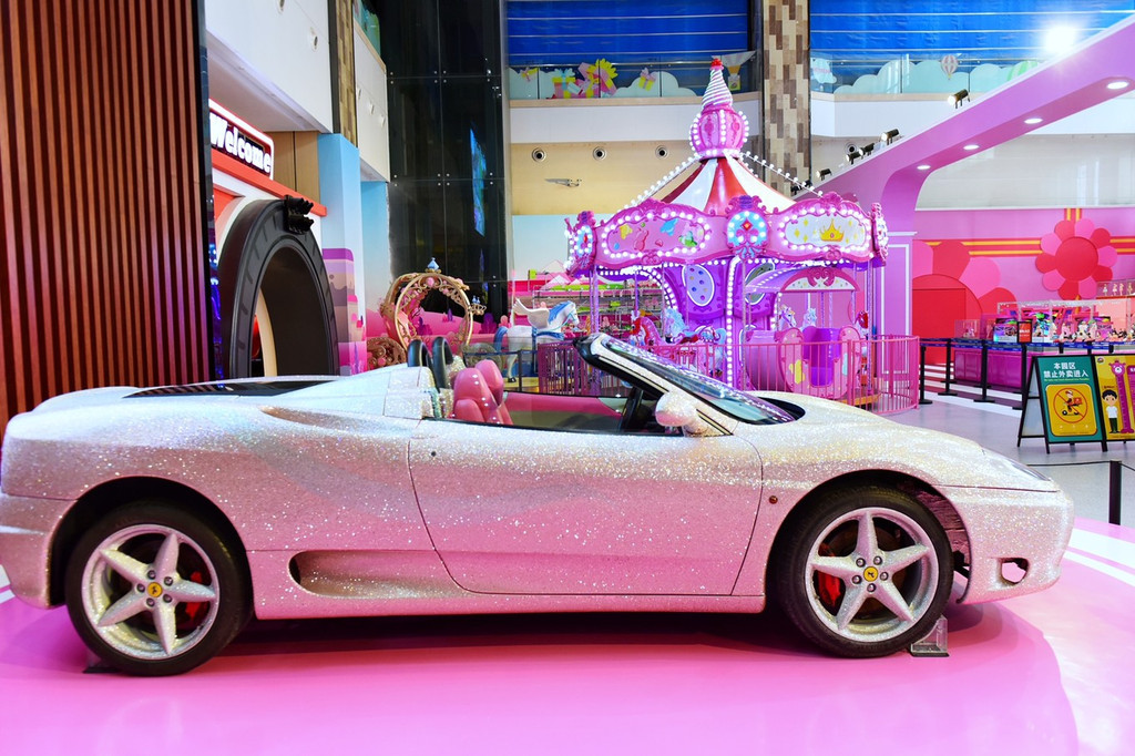 进门的那一刻,首先映入眼帘的是一辆镶满钻石亮闪闪的法拉利,旁边还有旋转木马等卡通拍照的好地方,有种走进童话世界的感觉。