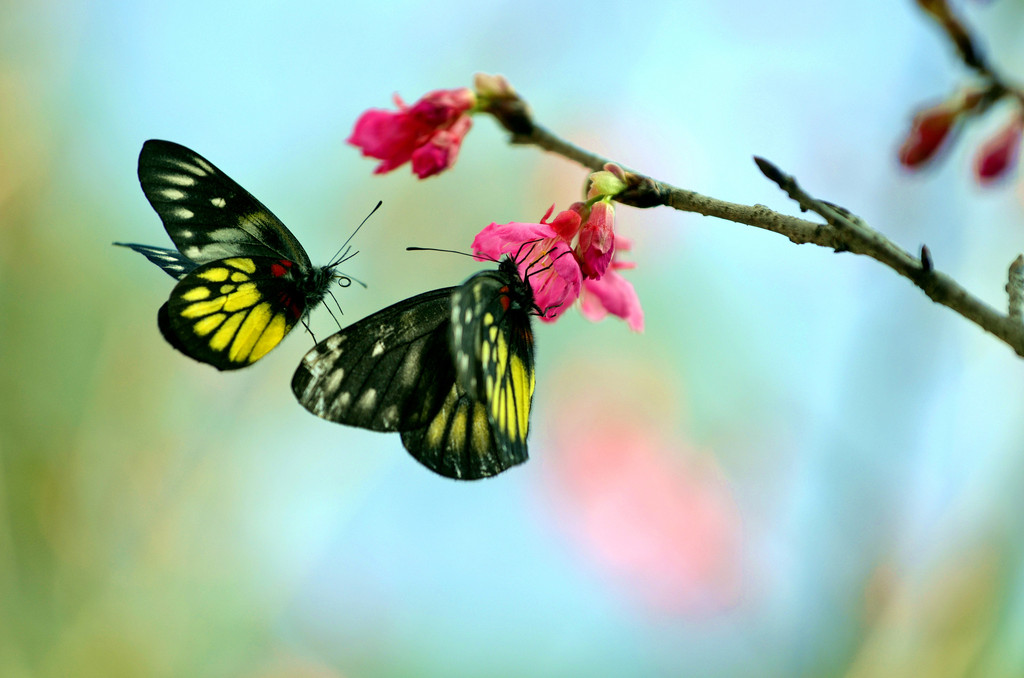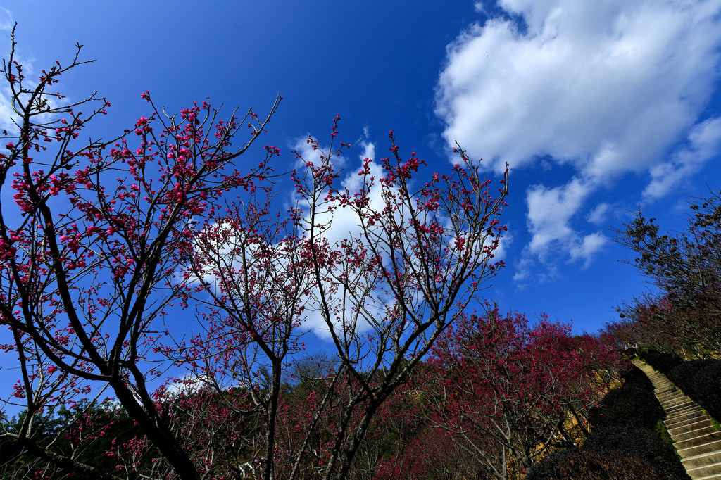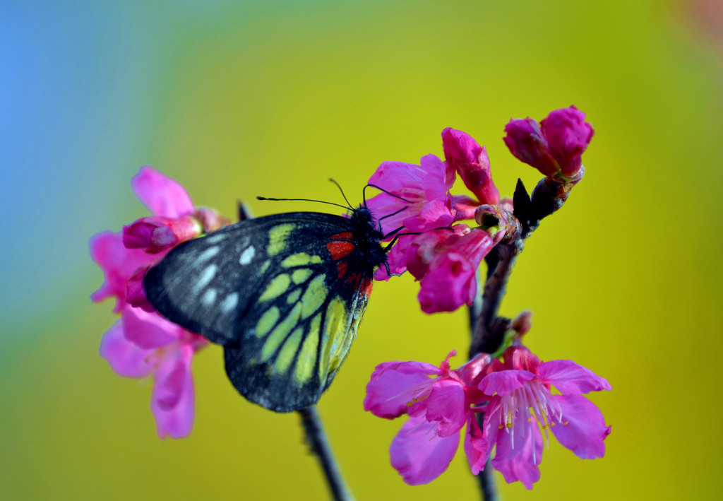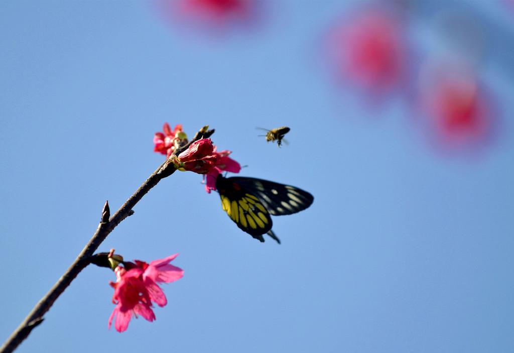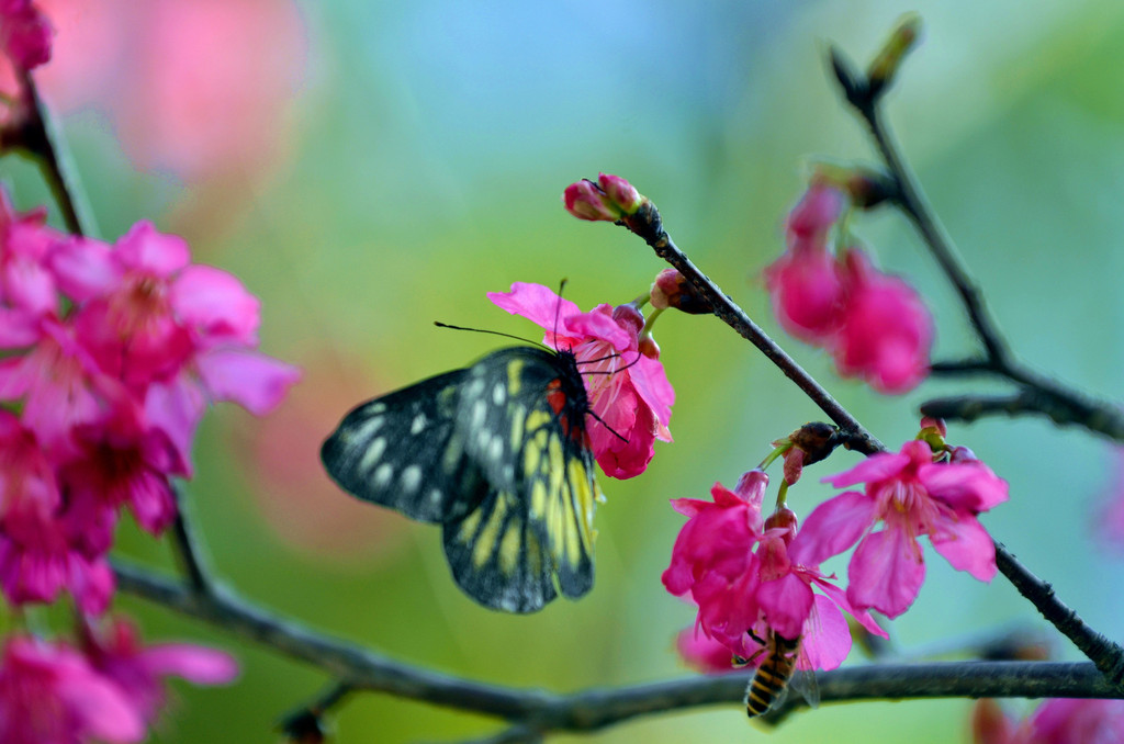 如果是早春,你还可以在大地花园中欣赏樱花,据说此花名叫钟花樱桃,是一年中最早开放的樱花,非常美丽,你看,各种蝴蝶、蜜蜂也闻香而来,纷纷采蜜吸粉,给这里的美丽增添了生机和活力。