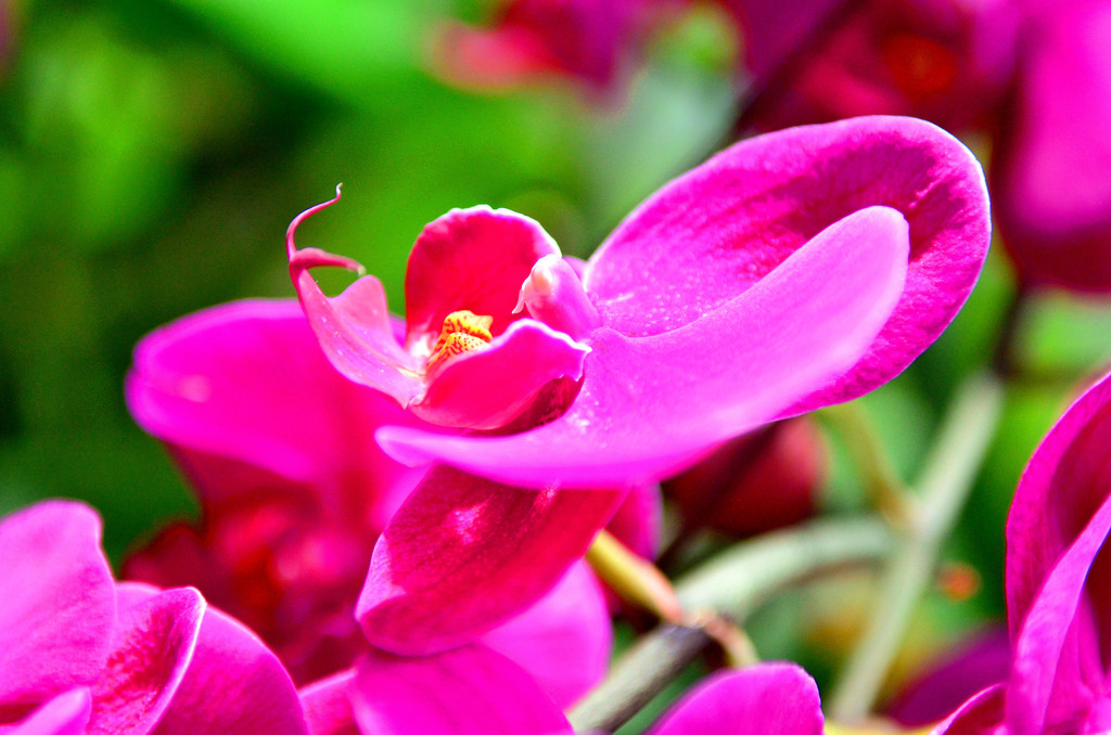 第四处是室内观赏植物区,这里有许多的花卉和阴生植物,如各种蝴蝶兰、吊蓝、兰花等许多花花草草,猪笼草等一些食虫植物乘机捕食,特别是跳舞兰鲜艳的花朵,宛然宫女踩着优美的舞步在跳舞,美丽极了。