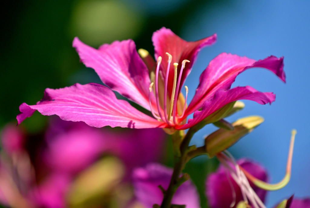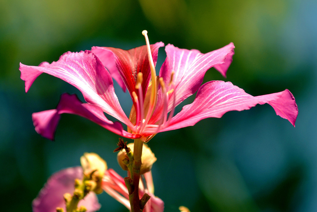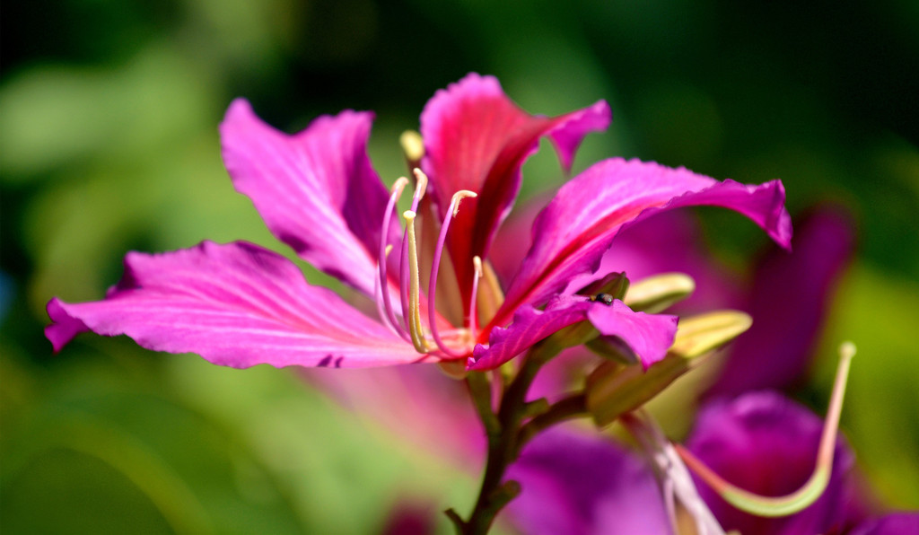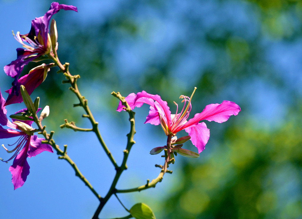 紫荆花,也叫红花羊蹄甲,常绿乔木,叶革质,圆形或阔心形,长10-13厘米,宽略超过长,顶端二裂,状如羊蹄,其中4瓣分列两侧,两两相对,而另一瓣则翘首于上方,形如兰花状;花香,有近似兰花的清香,故又被称为“兰花树”,花大如掌,五片花瓣均匀地轮生排列,红色或粉红色,十分美观。