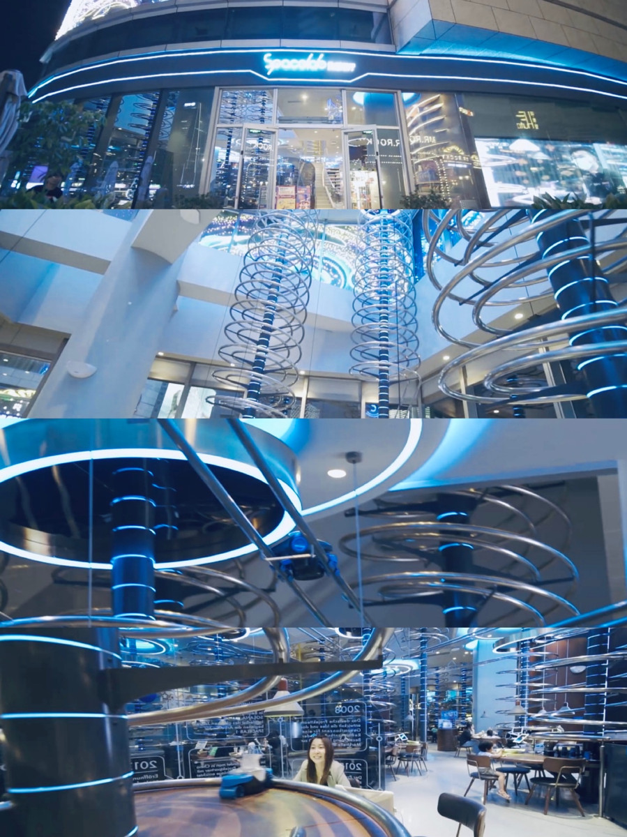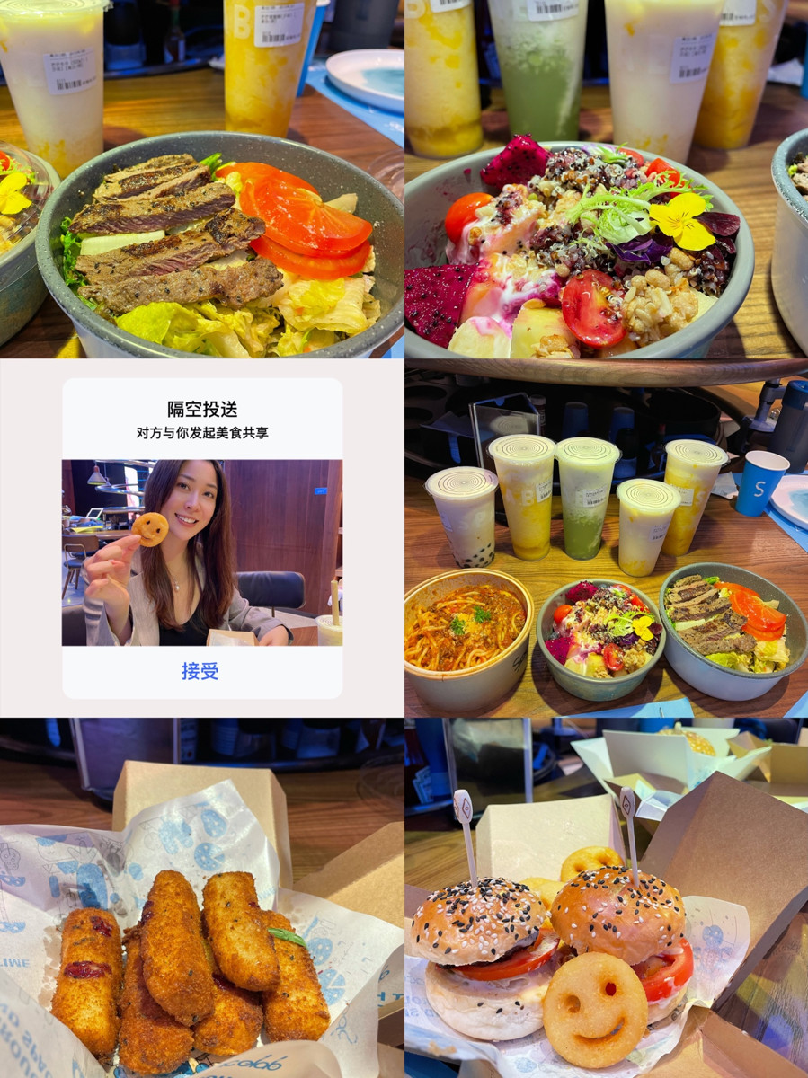 第三站,开车去体验一下网红失重餐厅Space Lab~路上的充电桩超级多,用小鹏app就可以查找,超级方便~夜幕降临,餐厅灯光全部开启,变成了魔幻的蓝色世界,17秒飞速的传菜模式,菜像坐着过山车一样火速飞到面前,未来感太强了!三桌客人会坐在一个区域(圆形桌会有一点点距离不会尴尬),你点的食物从天而降以后如果距离你太远可以转动桌子就能拿到啦(在你周围的客人还会好心帮你一起转动)?让你有一种新鲜用餐体验感?????,飞速下降的餐品很神奇居然不大会破坏造型,包装是采用木质环保盒的方式(用一种吃外卖的即视感哈哈?)一打开像开花?一样一种拆礼物的感觉我们的餐是完好无损呢??菜品也很丰盛,招牌大汉堡和肉酱意面都是必点~