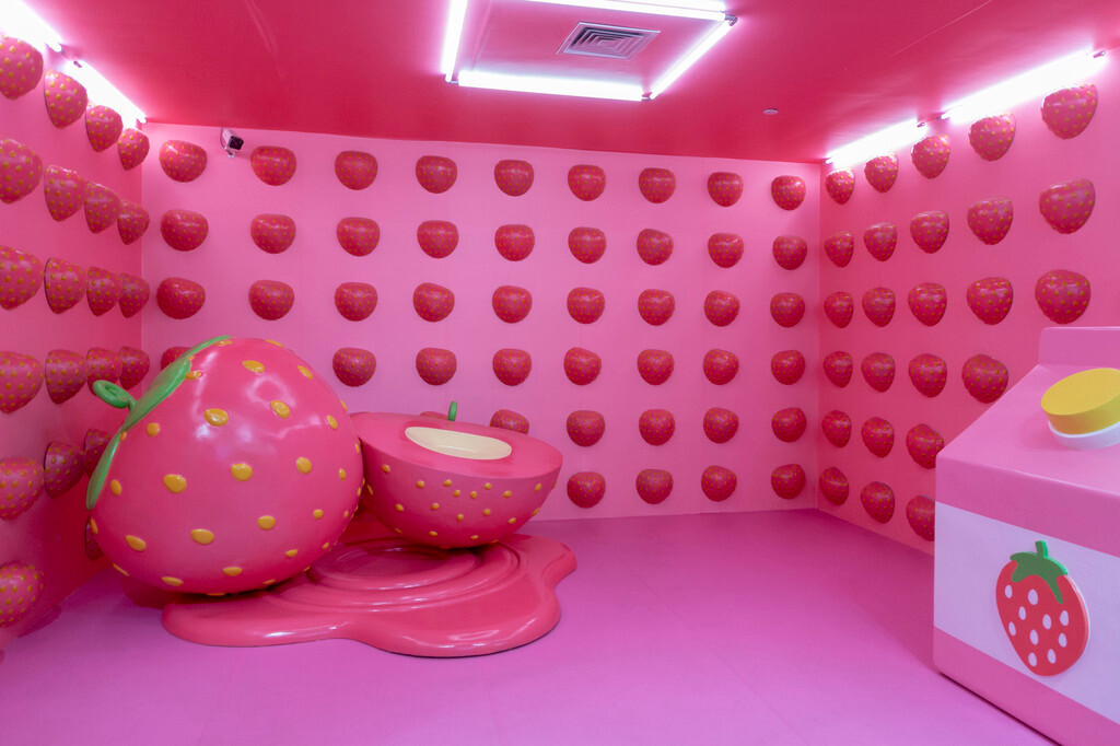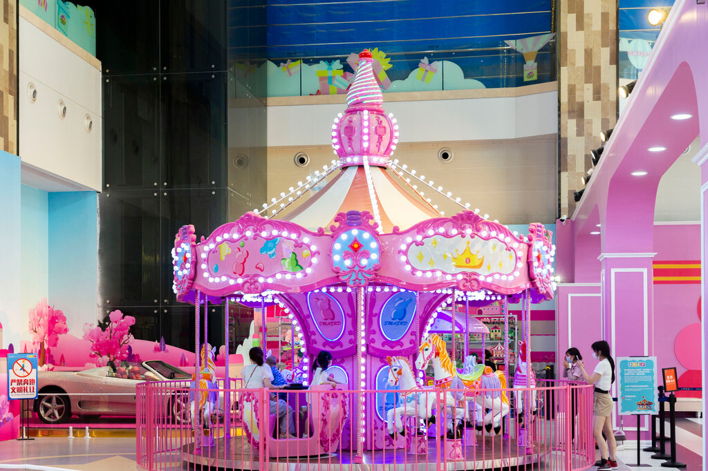 一进大门就是粉红梦想馆,左边就是粉色啵啵池、巨大高跟鞋,右边就是旋转木马、镶满粉钻的法拉利,中间就是梦幻的马车,他自己已经情不自禁地冲上前去要我拍照了。