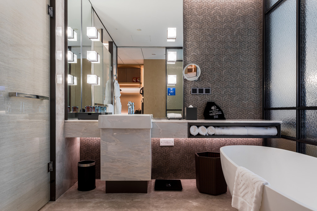 宽大明亮的镜子,左右对称布局的三张镜前灯,有一种明星化妆台的即视感,对于日常化妆的小姐姐来讲,真是超级有必要。独立的洗漱间,浴缸区,洗手间和沐浴间,为的就是确保每一处的体验都很nice。