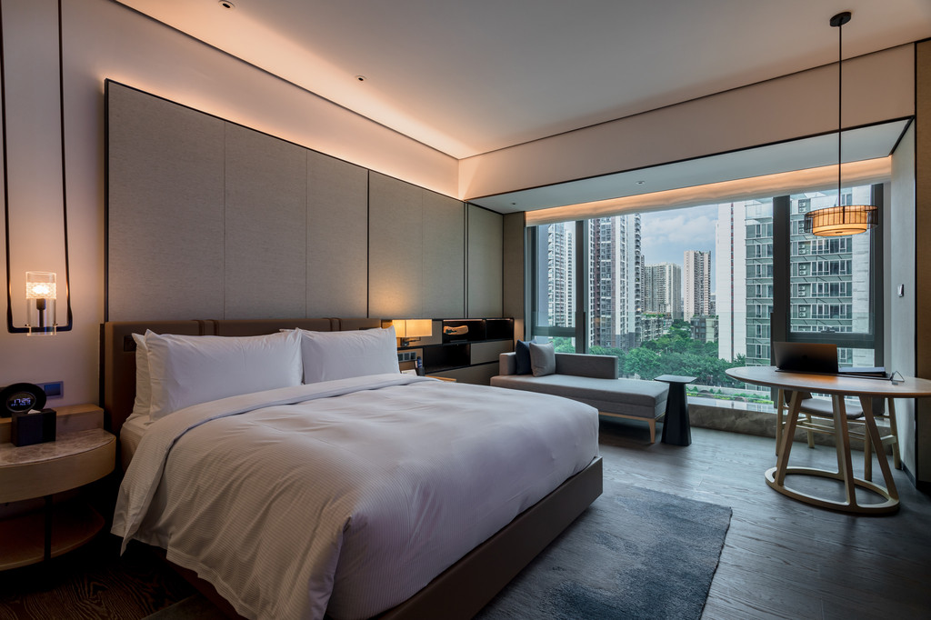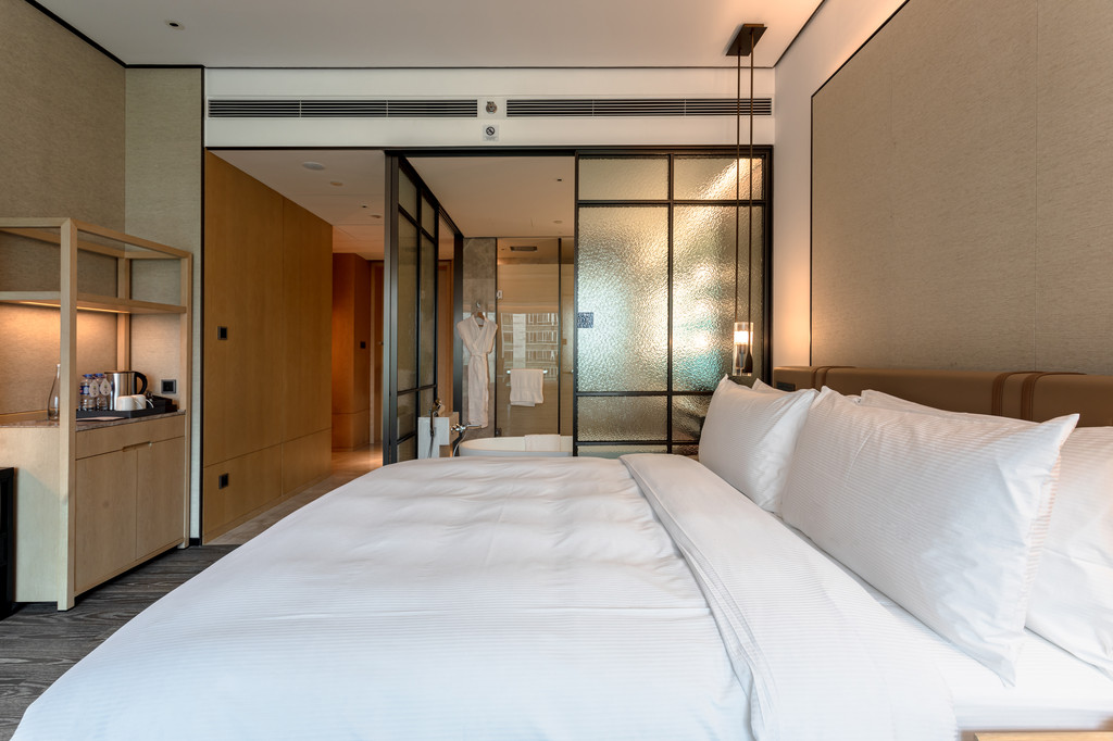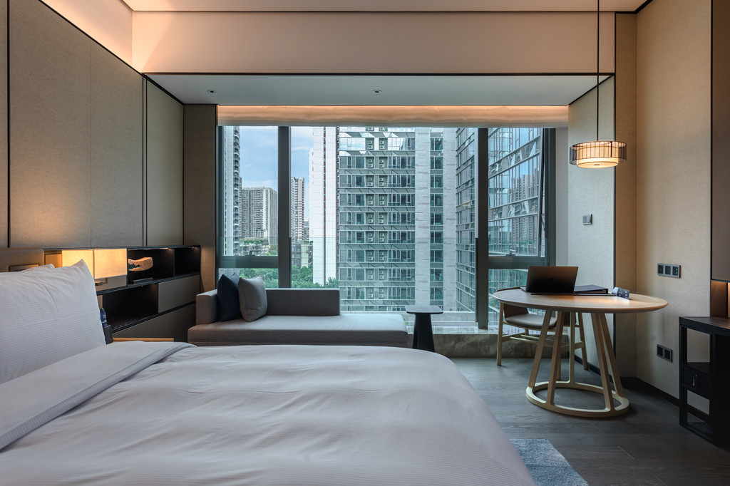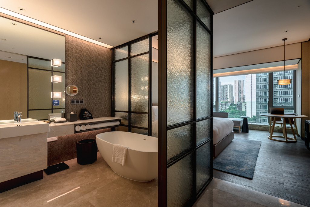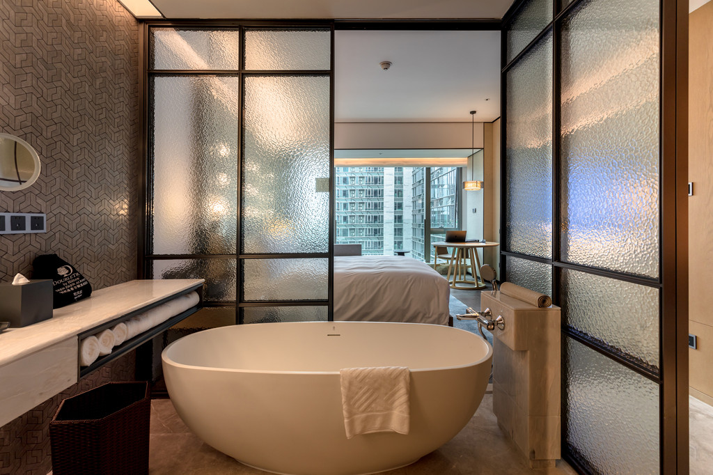 走进房间,最让我惊喜的是这里能同时将城市景观和绿树成荫的花园尽收眼底。一整面的落地玻璃,在视觉上达到了最大的享受,同时又能满足对自然光的享受之需。