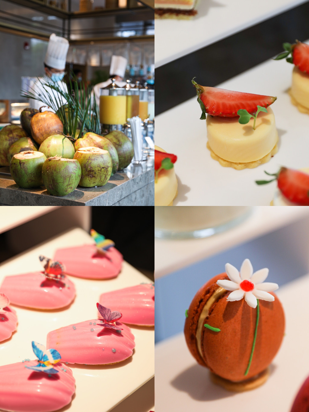 在享受完各种海鲜和大鱼大肉后,喝一杯葡萄酒,吃点甜品那是必备的,当然我还要了一颗夏日必备超级清甜的椰子。还有冷吃沙拉、蜜桃系列特饮、各式甜品、饮料等享用。
