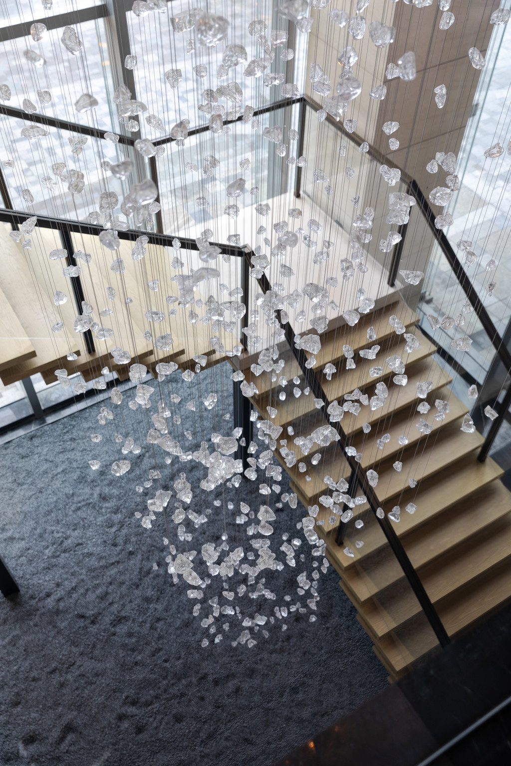 在来之前就有搜索了一下酒店的打卡处,除了后花园可以在这拍上一两个小时之外,酒店一楼还有一处很美的旋转楼梯,从屋顶到地面吊挂着玻璃艺术装置品,就像从空中形成了水晶瀑布。