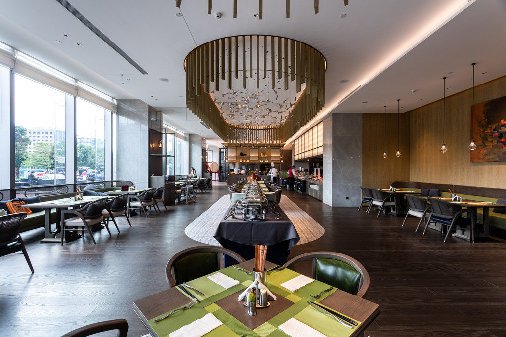 自助餐厅没有过多花里胡哨的装修设计,依旧追求高雅的品味,餐厅正中间的吊顶和地上铺设的瓷砖上下呼应,极具设计美学。