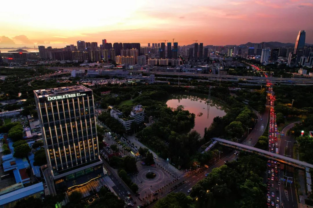 深圳南山希尔顿逸林酒店及公寓地处南山区经济中心活力地带,紧邻深圳硅谷——深圳高新技术产业园,举步可至南头古城、中山公园及荷兰花卉小镇等景点名胜。酒店地理位置优越,交通便利,周边拥有地铁一号线,距离深圳湾口岸及蛇口邮轮中心仅10公里,距深圳宝安国际机场仅16公里,集住宿、购物、餐饮、休闲、娱乐于一体,是商务出行及休闲出游的优质之选。一个城市的繁华,傍晚更能感受到,华灯初上,夜幕降临,一片灯火辉煌,繁华的夜景尽入眼底。城市灯光染红了整片夜空,街道变成了皓光闪耀的银河。酒店门口有一个风水球,风生水起,时来运转,做生意的朋友们都很喜欢的哦。一个酒店好不好,看大堂就知道,酒店的大堂很气派,周围的浮雕壁画很有观赏韵味。【逸林城景套房】