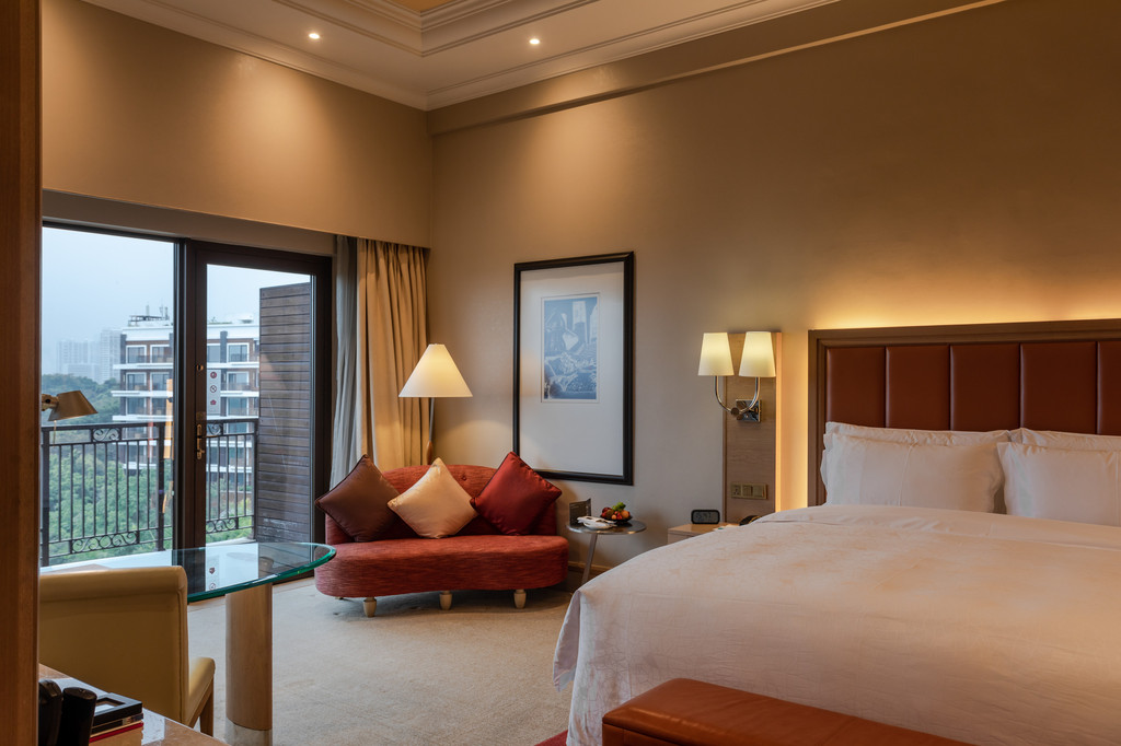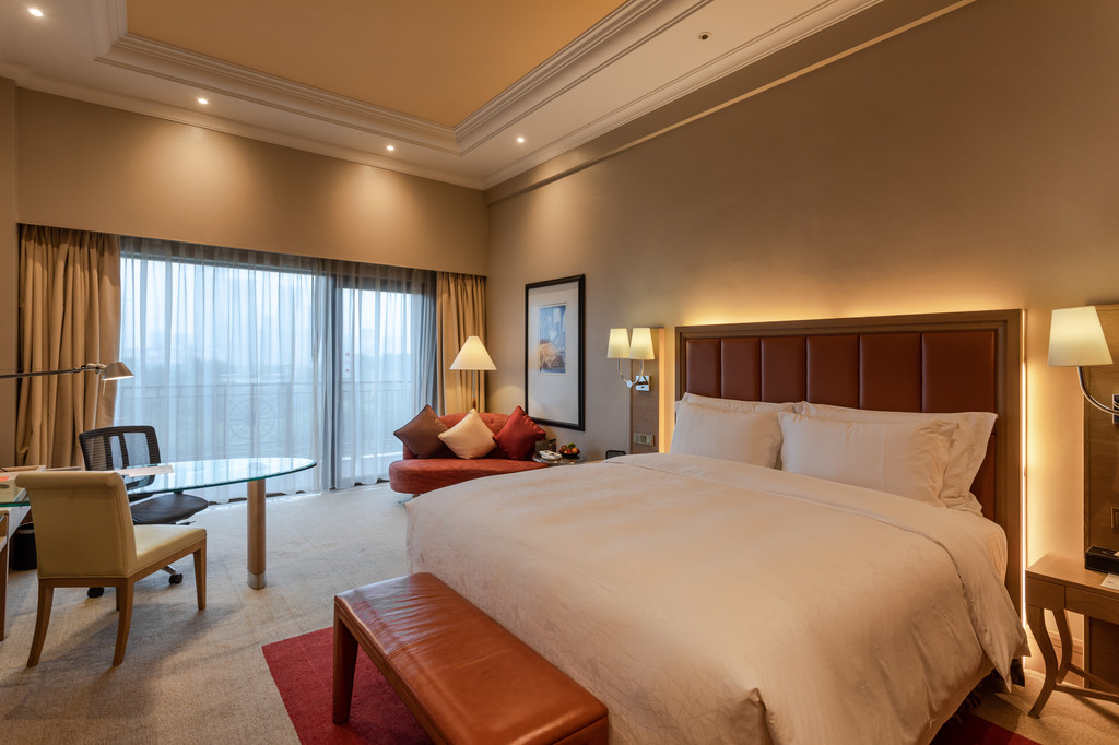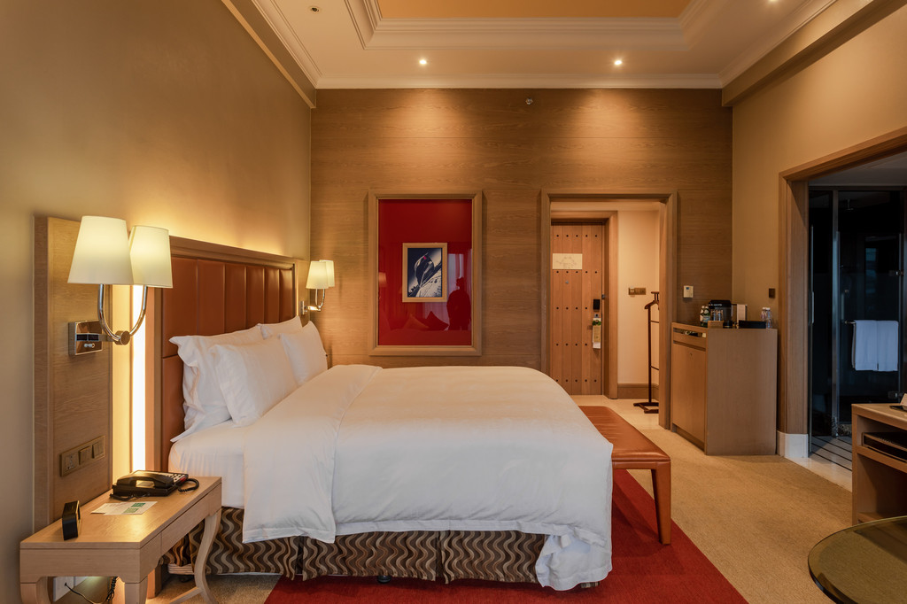 刷卡进门,行政楼层大床房都有自带一个大阳台,可以欣赏泳池和园林景观。房间楼层三米多高,装修风格简约大气,暖色调的灯让整个房间很温馨,床边的壁画是一副以西班牙红为主色调装裱抽象画作,沙发区则是一副黑白装裱的简约蓝色画作。