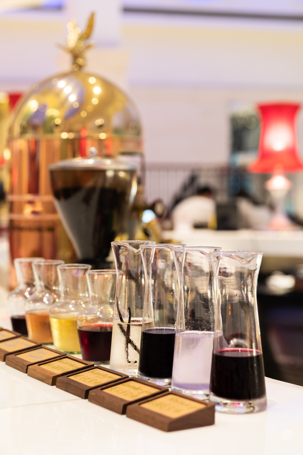 光从这摆设上看,就被这迷人的玻璃器皿吸引住了。为了将本地风土更好的呈现给大家,酒店还特意融合当地的本草花卉,推出钻禧周年系列滴漏鸡尾酒,木槿花园、帝兰、漫天橙星、薰衣草四种风味,听起来就很美。