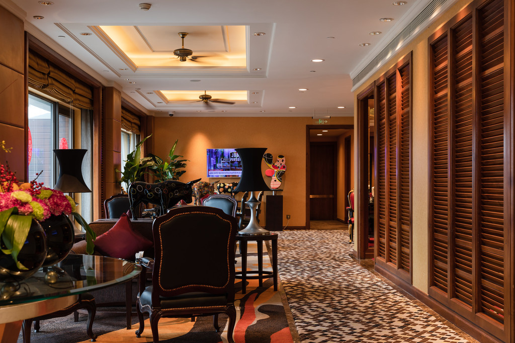 酒店行政酒廊位于酒店七楼,色调以厚重感为主,古典风格的吊扇、复古真皮桌椅、质感迷人的台灯,烘托出高贵之气。同时分为室内区域和室外区域,天气好的时候很适合在户外呼吸自然清新,也可享受室内的静雅舒适。