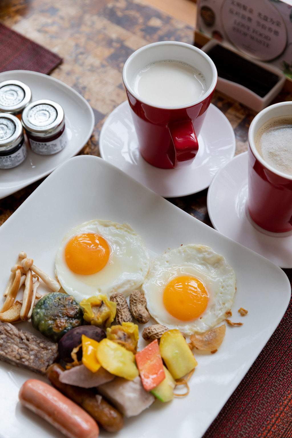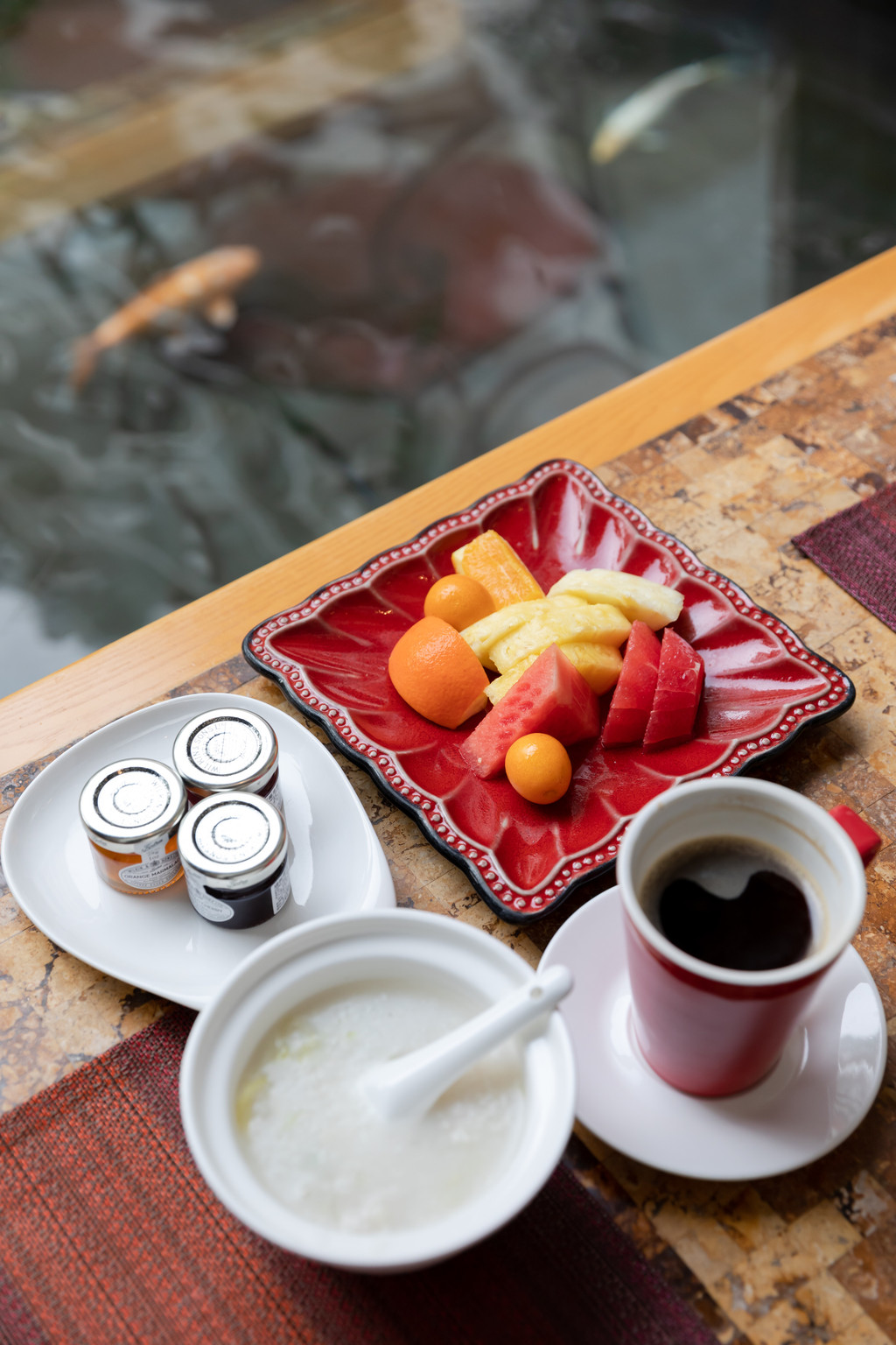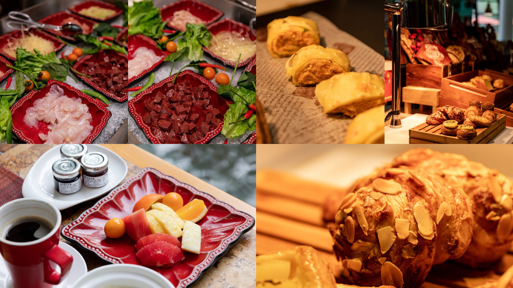 酒店的自助早餐在负一楼的自助餐厅,特别推荐靠近水池的位置,或是坐户外享用,因为酒店的锦鲤非常多,也非常漂亮,一边享受早餐一边欣赏锦鲤,甚是美好。
