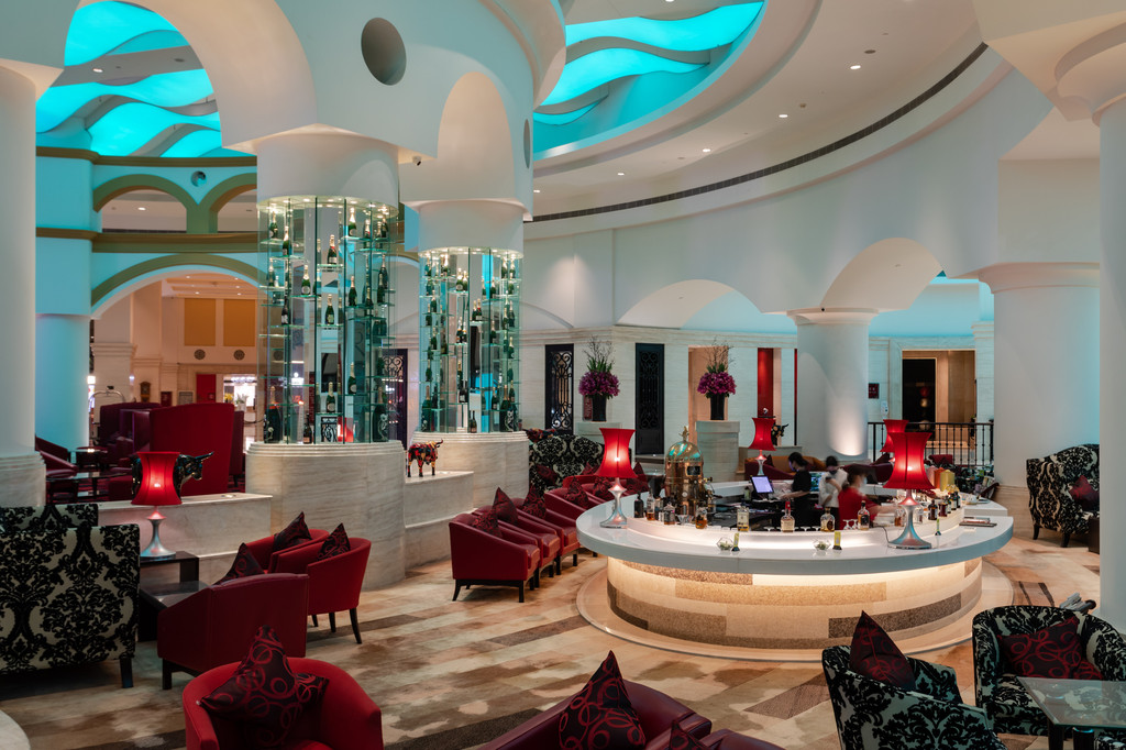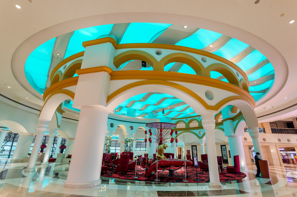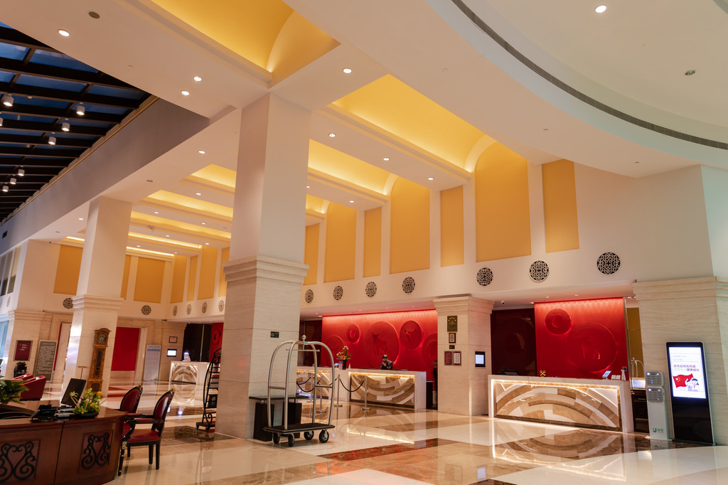 酒店处处可见西班牙红,红色前台背景加上工作人员甜蜜的笑,让人感受到热情温暖。大堂正中央则是以西班牙剧场为元素设计的圆形剧场式休息区,西班牙靠海,海洋也是他们不可或缺的一部分,所以设计师把大海的波浪元素用与苍穹之顶上,仿佛置身海洋之中远航。