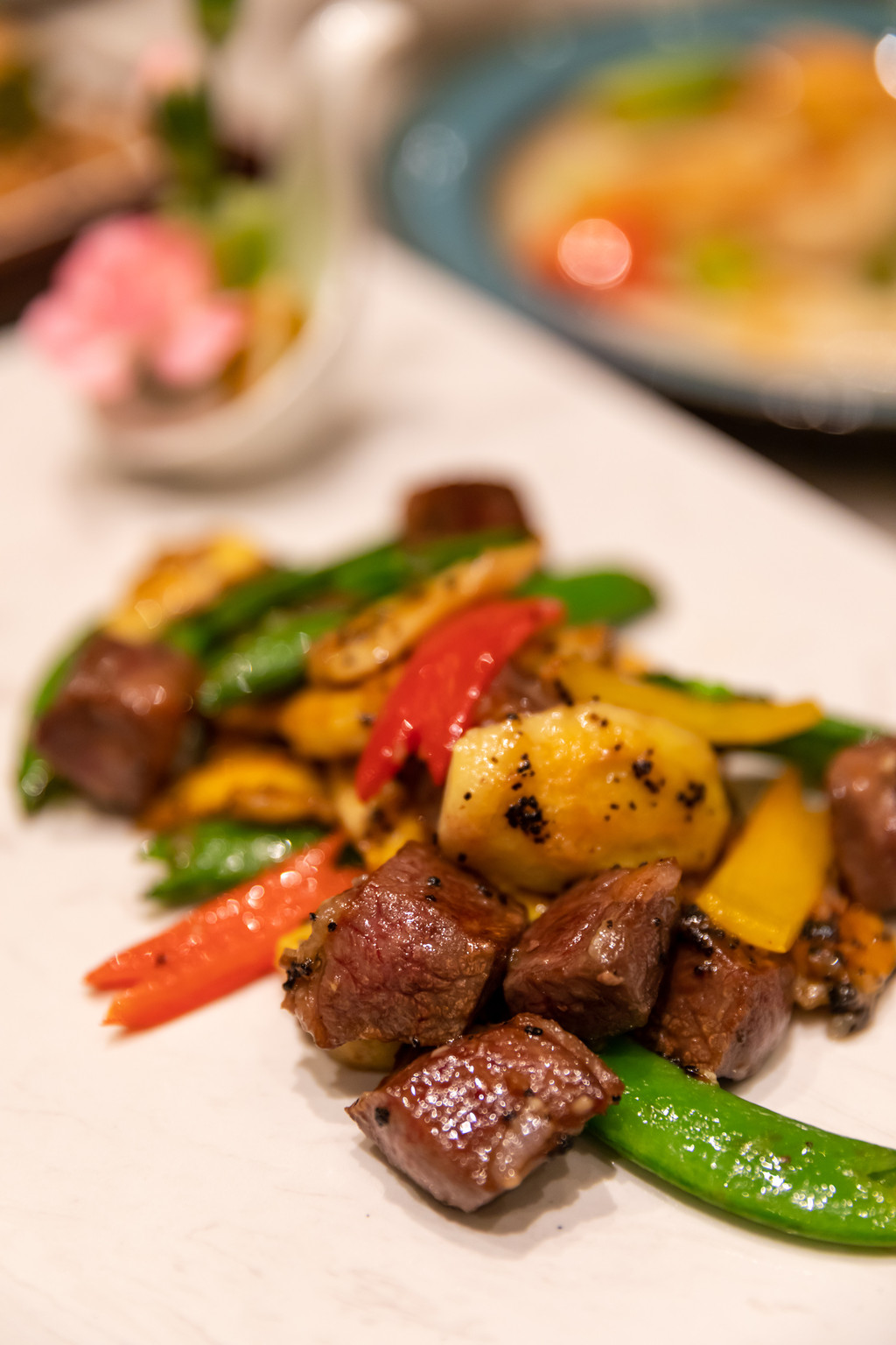 生活在广东,喝汤是必须的,松茸菌炖角螺汤,松茸浓郁的菌香和淡淡的海鲜融合,极具鲜美。芦笋白玉菇炒澳带,个头超大澳带也是让我大饱口福了,黑松露牛肝菌雪花牛肉,鲜嫩的牛肉要成趁热吃,口感极佳。