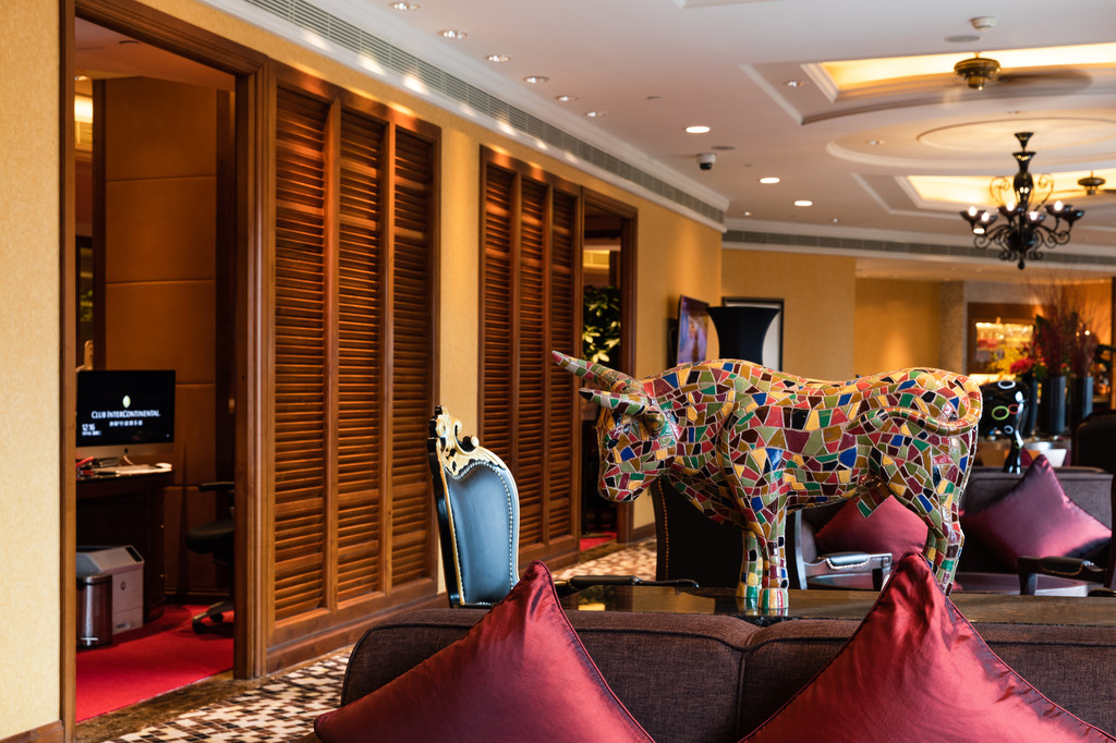 公区摆放的碎瓷器拼接公牛雕塑,很具有艺术感。