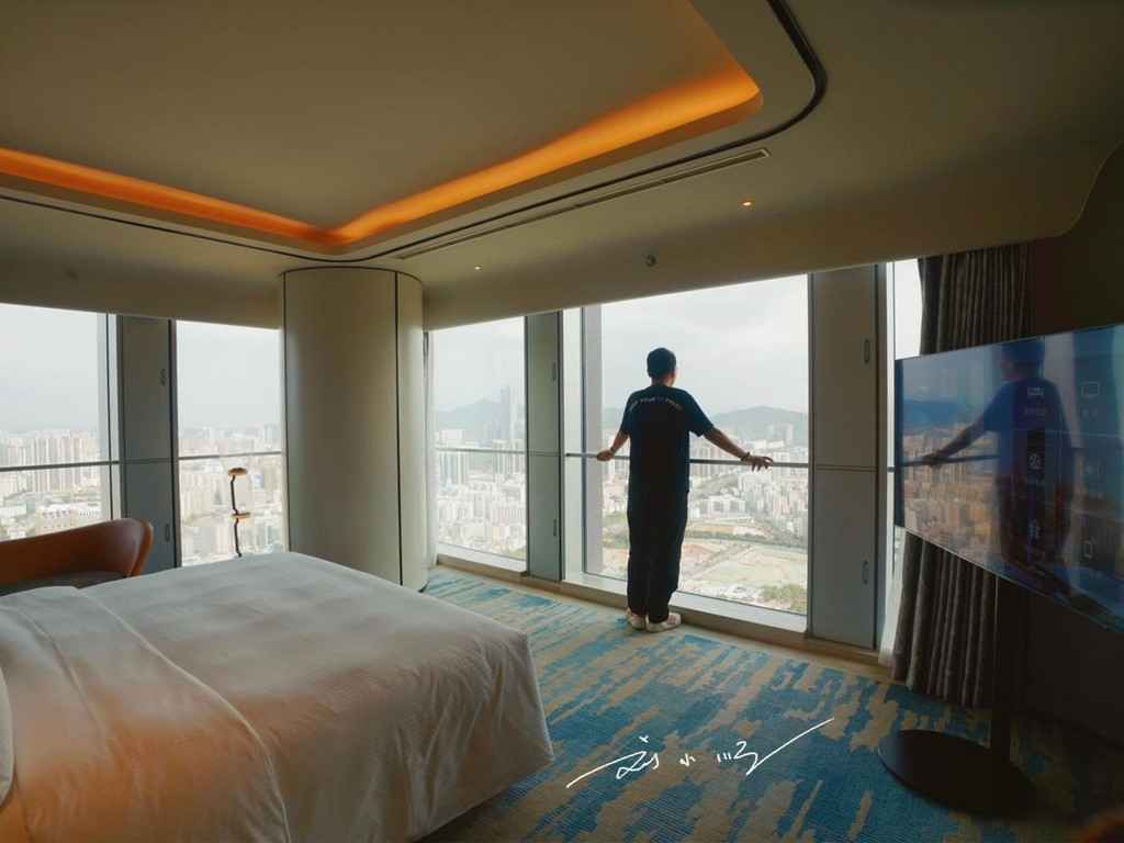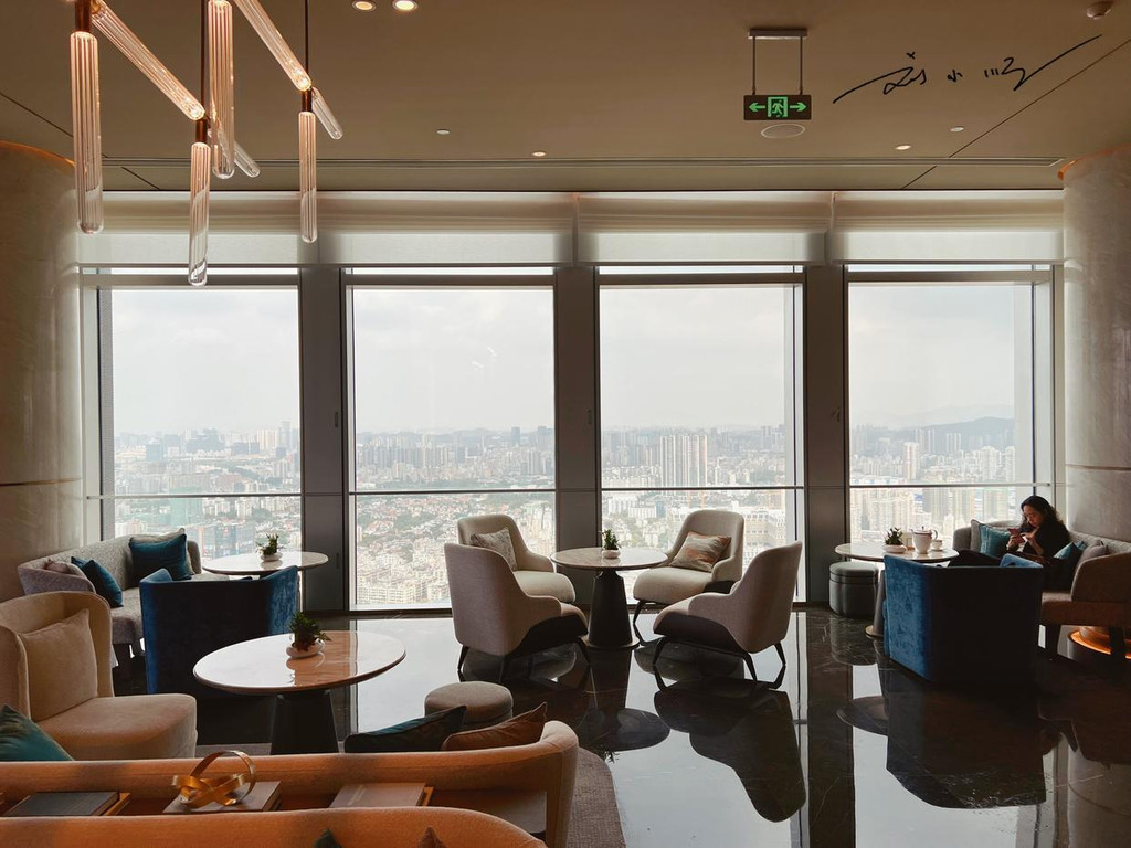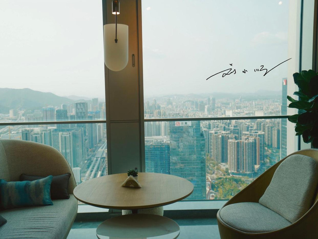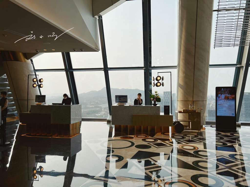 “深圳深铁铂尔曼酒店”的大堂位于46楼,窗外视野特别好,超大的落地玻璃让你360度俯瞰深圳,连办理入住都变成了一种享受。