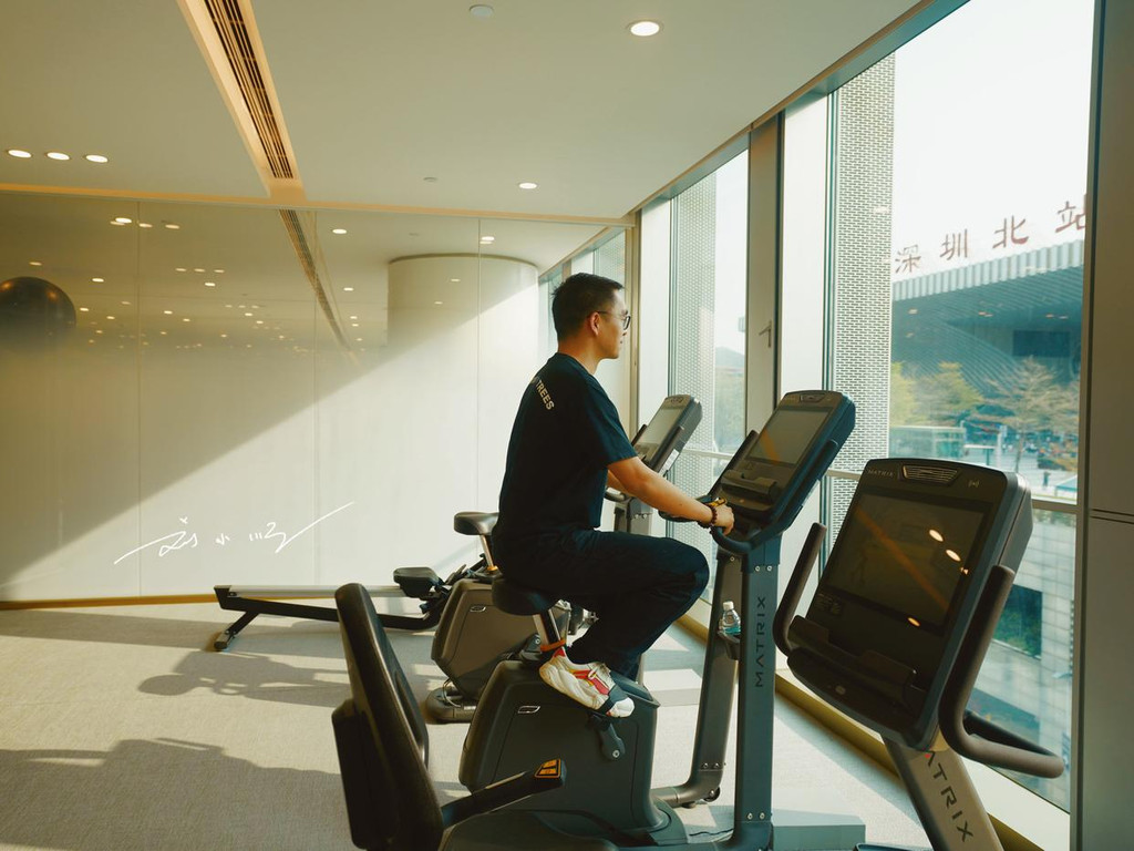 除了漂亮的露天泳池之外,“深圳深铁铂尔曼酒店”的健身房里各种器械也都相当齐全,视野同样很好,让你运动起来都非常享受。