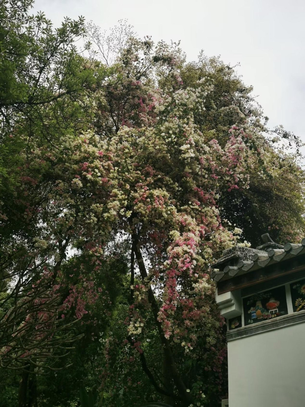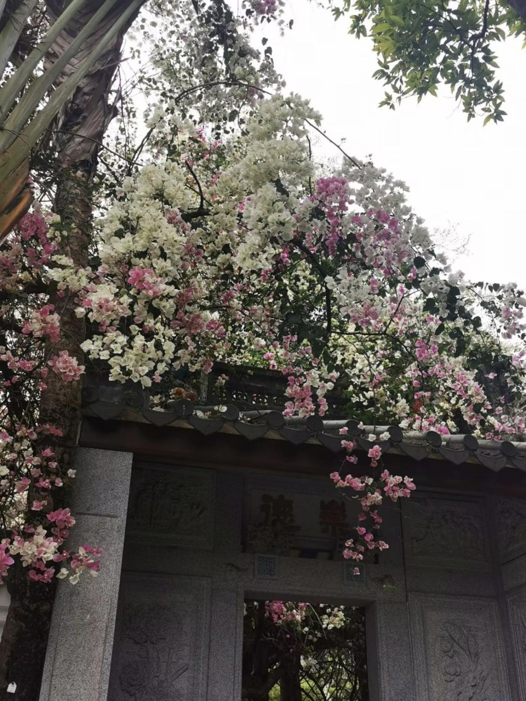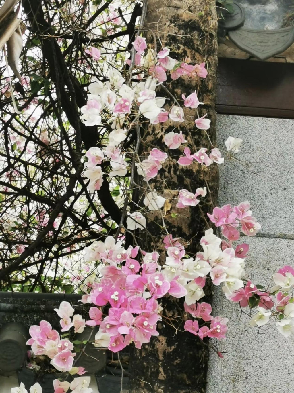 之后去了深圳园博园汇芳园,来看三角梅瀑布。这是一颗非常高大的三角梅,目测至少十米高,生长在一座客家风格的庭院里,树上粉白两色的花朵随枝条向下垂落,从庭院里伸出来,真是宛如瀑布一般,据说现在还不算是盛花期。盛花期的时候更壮观。