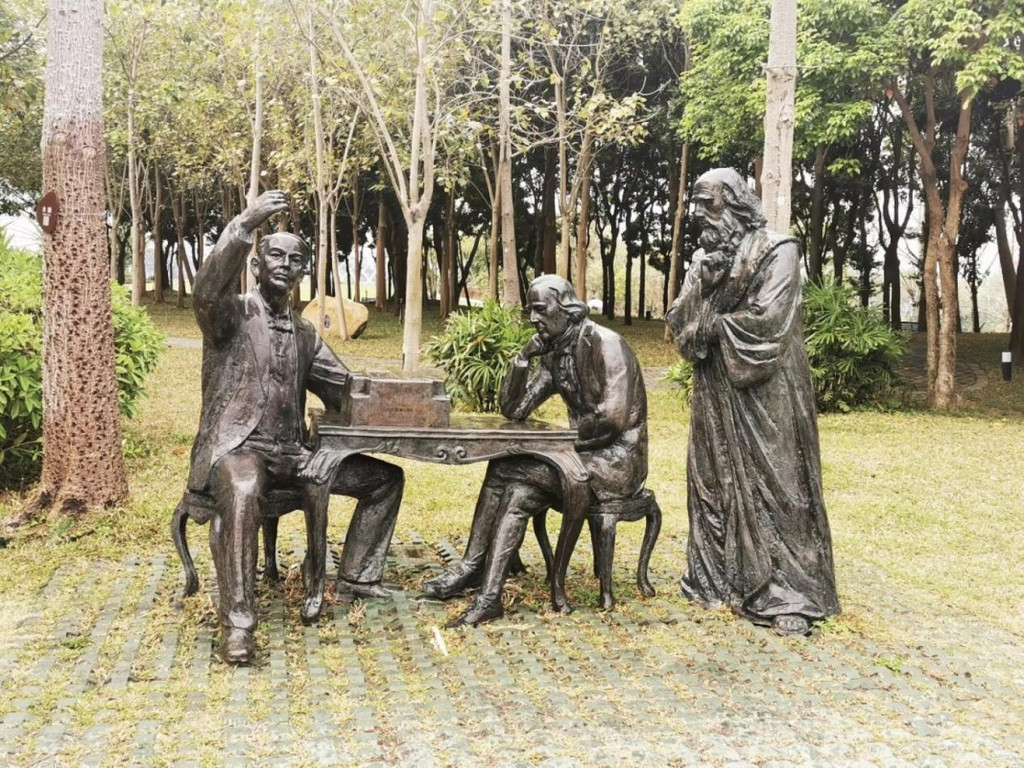 从这里出来,我们去了人才公园,这个公园面积也很大,植被茂密,我们是从东门进去的,里面有湖(其实是和大海相通的),有大草坪,还有很多介绍古今中外、世界各国的科学家等各类人才的展示牌和雕塑,令人有耳目一新的感觉。