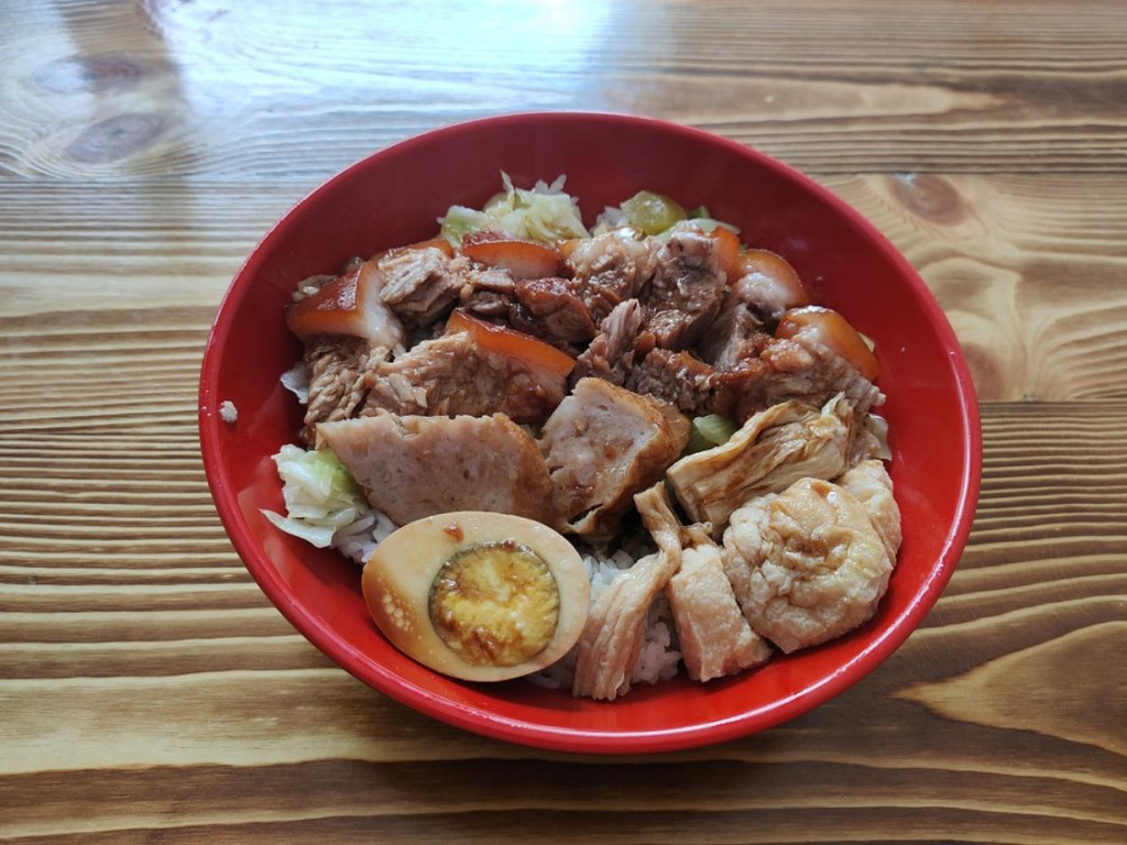 来了这,当然是要点一份经典的猪脚饭拉,不久后老板娘便端了上来。瞧瞧,软糯入味、酱汁浓郁、肥而不腻的猪肘肉配上越爵越香的肉卷、软乎乎的豆腐、半个卤蛋和些许白菜米饭,刹那间,味蕾又可以好好满足了。