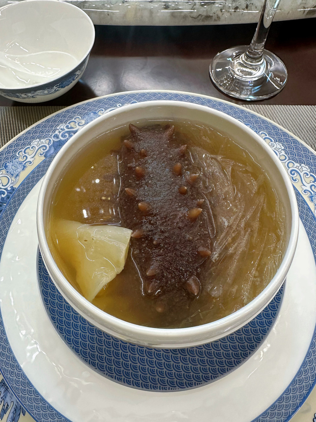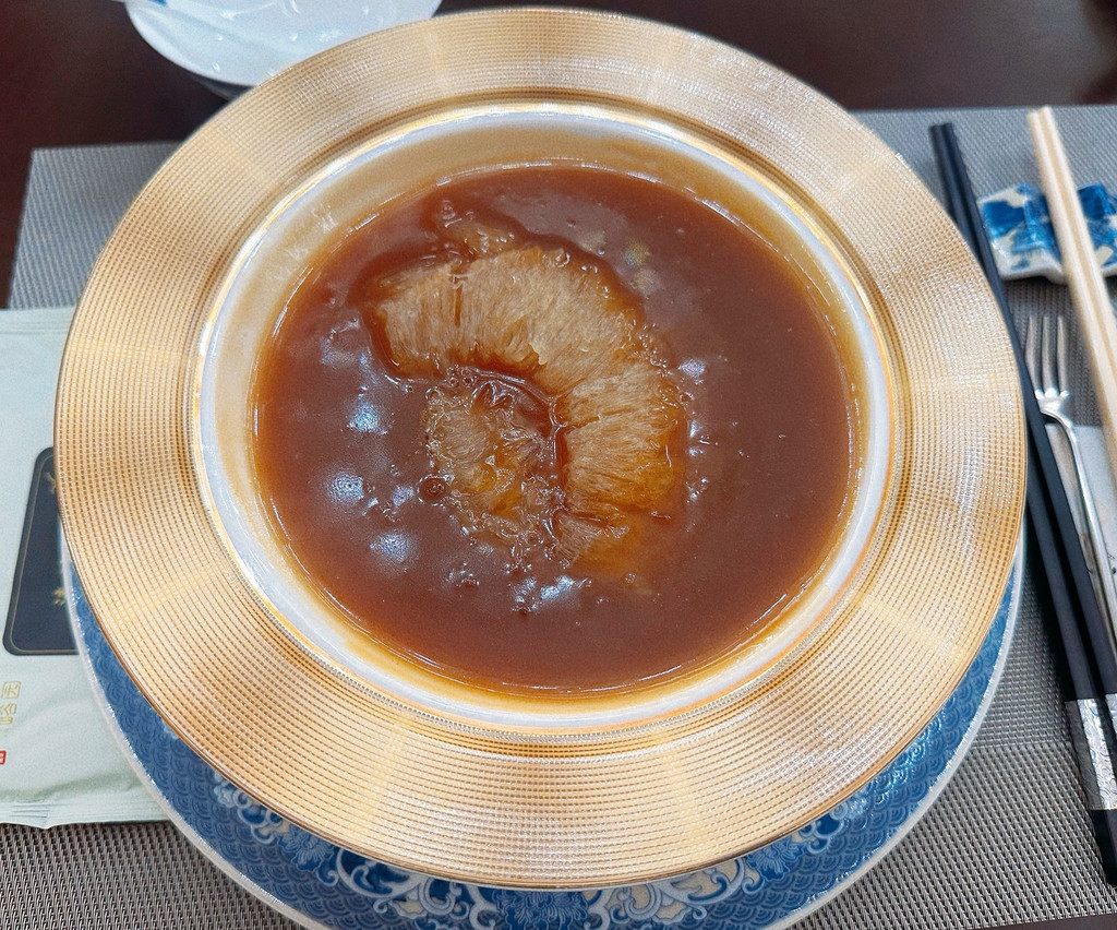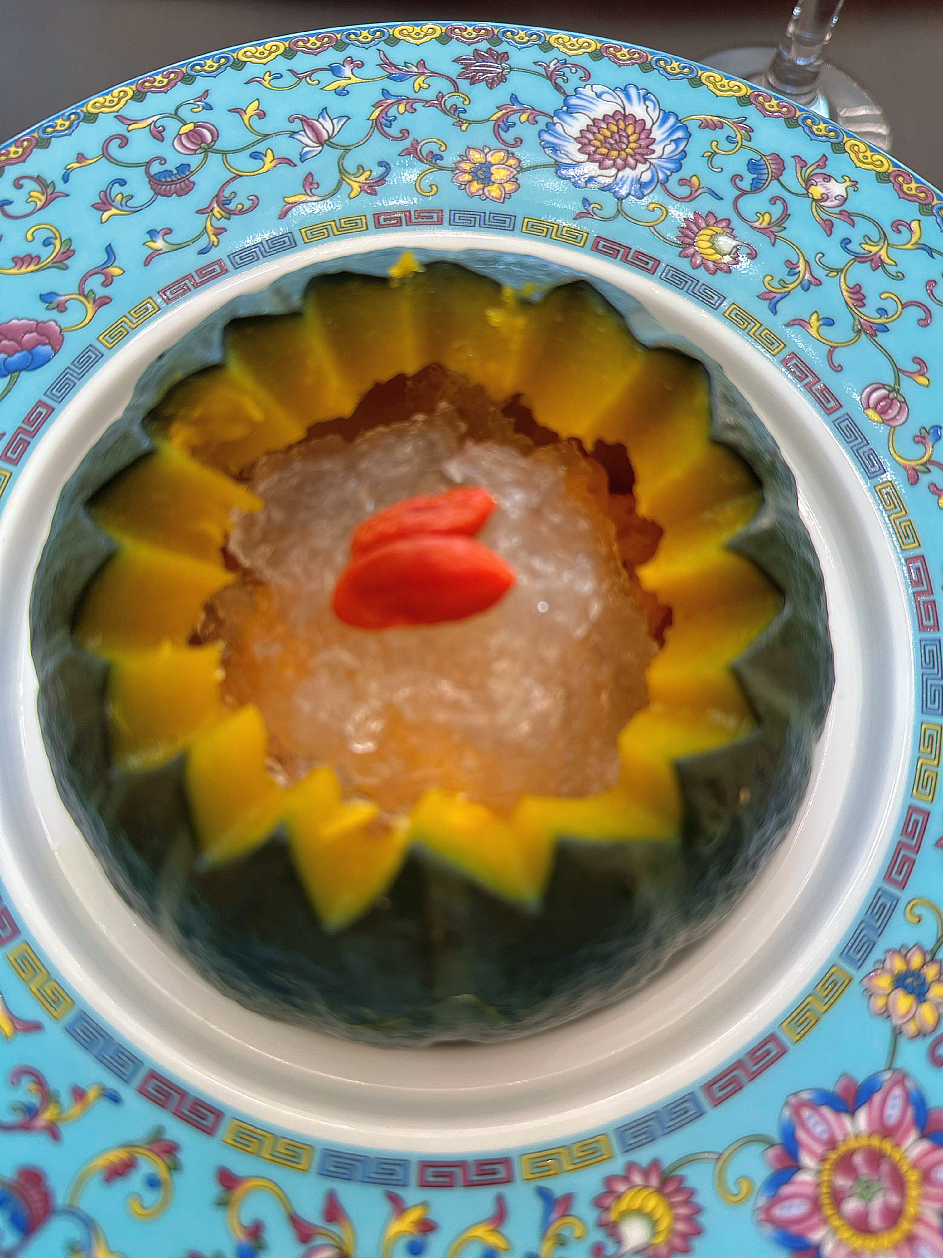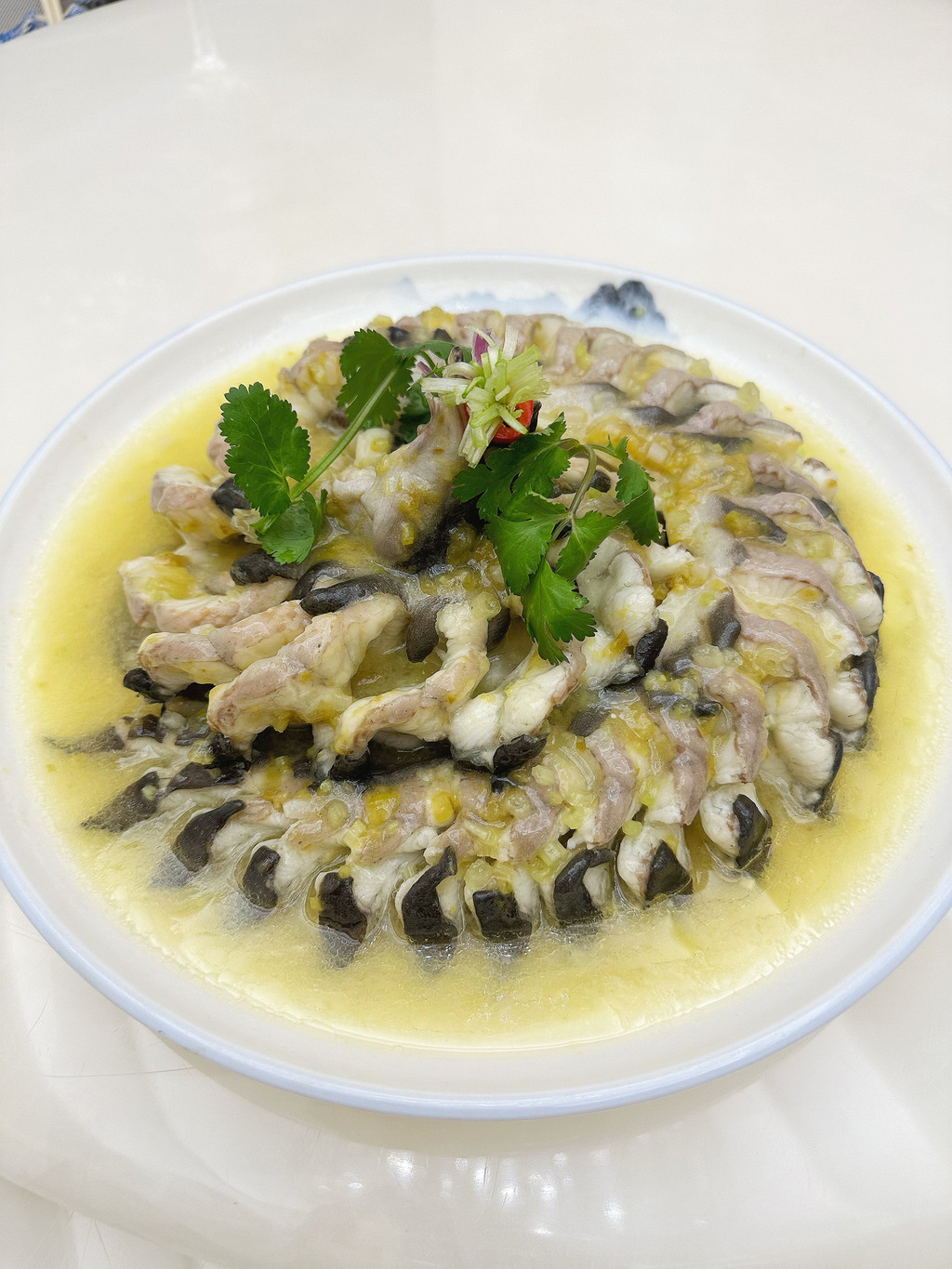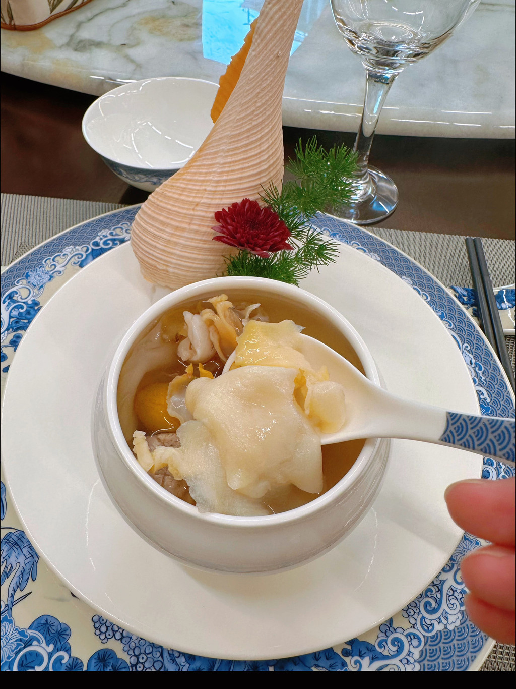 菜品说话:潮汕菜的“高定版本”。如果说普通潮汕大排档是市井烟火,那峪园就是实验室级的艺术创作。招牌卤水鹅肝竟搭配了十年新会陈皮解腻。最令人惊艳的当属「金瓜燕」,用南瓜蓉与鸡汤熬制的金汤,包裹着如丝如缕的鱼翅,入口的瞬间就能理解什么叫“体面的味道”。